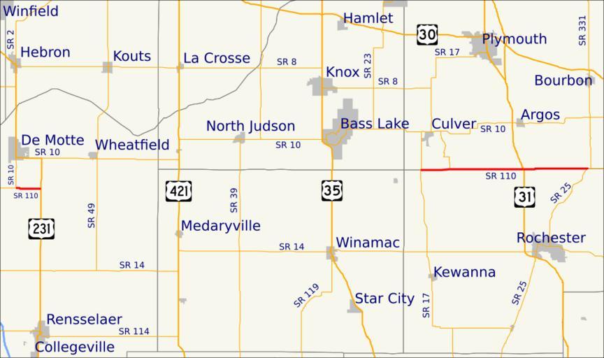 Keywords: Map of Indiana State Road 110.svg This is a map which shows the route of Indiana State Road 110 in the United States My own work using freely-available shape data and custom-written MapScript applications 2008-03-09 Omnedon Road maps of Indiana SR110 |