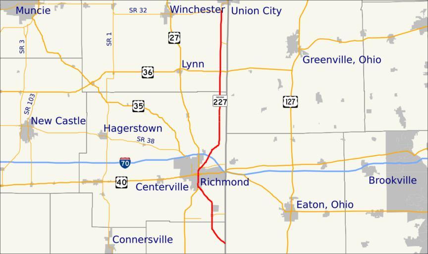 Keywords: Map of Indiana State Road 227.svg This is a map which shows the route of Indiana State Road 227 in the United States My own work using freely-available shape data and custom-written MapScript applications 2008-03-16 Omnedon Road maps of Indiana SR227 |