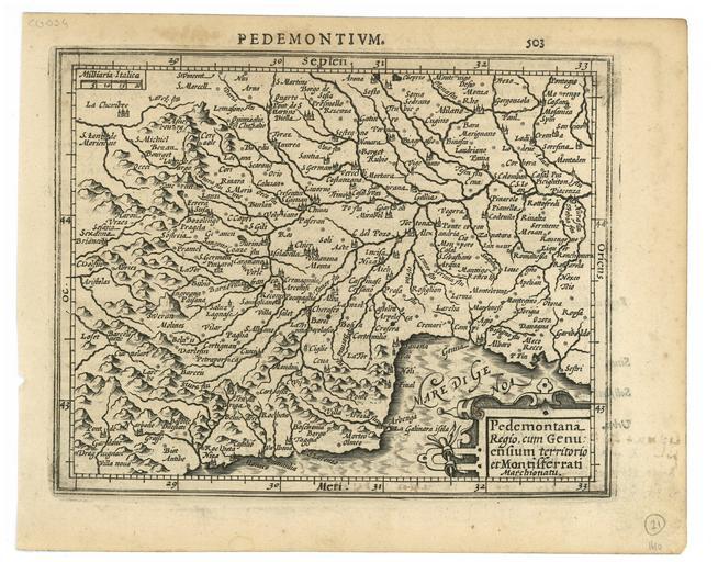 Keywords: Map italy monferrato CG 34 PEDEMONTIUM.jpg PEDEMONTIUM Nel cartiglio in basso a sinistra si legge Pedemontana/ Regio cum Genu/ensium Territorio/ et Montisferrati / Marchionatu In alto a sinistra la scala in miglia d ™Italia Incisione su rame mm 172 x 215 Proviene dalla versione in latino di quel che può considerarsi il primo atlante tascabile moderno l ™epitome in formato ridotto del Theatrum Orbis Terrarum del cartografo e umanista Abrham Ortelius L ™edizione da cui la mappa è tratta fu stampata ad Anversa verso la fine degli anni Ottanta del Cinquecento own scan 2014-05-12 16 38 24 2014061810021504 PD-old-100 Old maps |