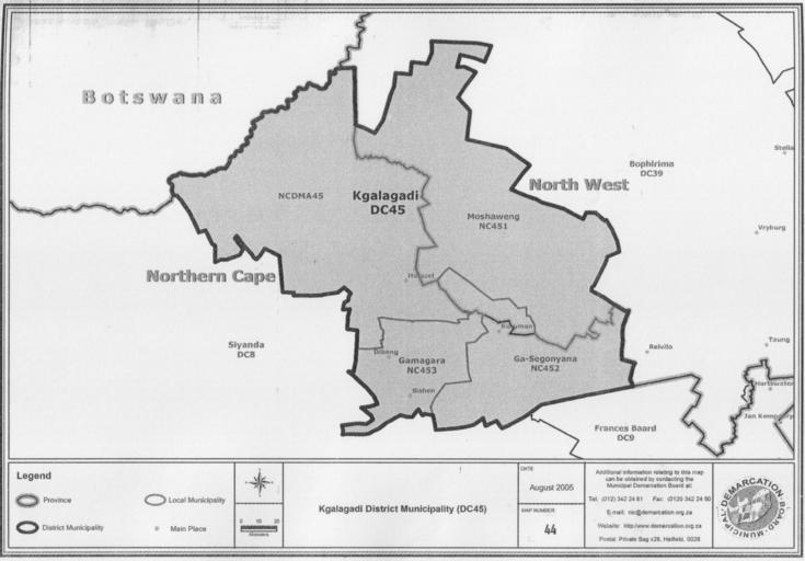 | Keywords: Map No. 44 of Schedule 2 to Notice 1998 of 2005.png Notice 1998 of 2005 Depicts the boundaries of the Kgalagadi District Municipality File Notice 1998 of 2005 djvu Municipal Demarcation Board of South Africa 2005-10-31 PD-South-Africa-exempt Maps of Northern Cape municipalities with 2006 borders Notice 1998 of 2005 |