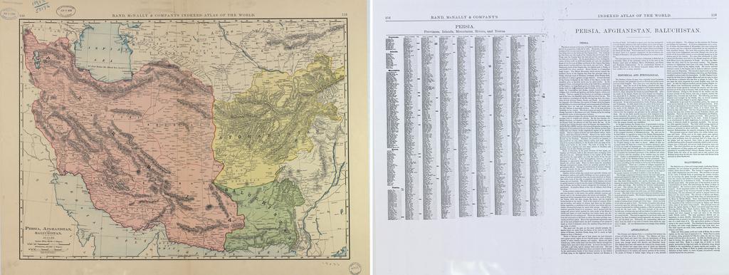 | Keywords: Map of Persia, Afghanistan and Baluchistan - 1898.tif en Chicago-based Rand McNally became a major publisher of atlases maps globes and travel guides in the United States in the second half of the 19th century This map of Persia as Iran was known until 1935 Afghanistan and Baluchistan is from the 1898 edition of Rand McNally Cos Indexed Atlas of the World Containing Large Scale Maps of Every Country and Civil Division upon the Face of the Globe Together with Historical Statistical and Descriptive Matter Relative to Each The atlas contains two volumes one with maps of the United States the other with maps of foreign countries This map features a list of the provinces islands mountains rivers and towns on the map as well as short descriptive essays about the countries depicted Baluchistan is a region bounded by Iran on the west Afghanistan on the north and the Arabian Sea to the south A historic invasion route to India it was crossed by Alexander the Great in 325 BC In the late 19th century it came under British control In 1947 it became part of Pakistan fa نقشهٔ ایران، افغانستان و بلوچستان ۱۸۹۸ میلادی ar أصبحت راند ماكنالي التي كان مقرها شيكاغو ناشرا كبيرا للأطالس والخرائط والكرات وأدلة السفر في الولايات المتحدة في النصف الثاني من القرنالتاسع عشر وقد وردت هذه الخريطة لبلاد فارس كما كانت تُعرف إيران حتى عام ١٩٣٥ وأفغانستان وبلوشستان في طبعة عام ١٨٩٨ للأطلس المفهرس للعالم، الذي نشرته راند ماكنالي وشركاه ويشمل خرائط كبيرة المقياس لكل بلد وقسم مدني على وجه الكرة الأرضية، مع مواد تاريخية وإحصائية ووصفية متعلقة بكل منها،ويتضمن الأطلس مجلدين، أحدهما لخرائط الولايات المتحدة والآخر لخرائط الدول الاجنبية وتتضمن هذه الخريطة قائمة بالمقاطعات والجزر والجبال والأنهار والبلدات المبينة على الخريطة، فضلا عن مقالات وصفية قصيرة عن الدول المرسومة وبلوشستان منطقة تحدها إيران من الغرب وأفغانستان من الشمال وبحر العرب من الجنوب وبلوشستان طريق غزو تاريخية للهند، وقد عبرها الاسكندر الأكبر في ٣٢٥ قبل الميلاد احتلتها بريطانيا في أواخرالقرن التاسع عشر وفي عام ١٩٤٧أصبحت جزءا من باكستان es Rand McNally establecido en Chicago se convirtió en un importante editor de atlas mapas globos terráqueos y guías de viaje en los Estados Unidos en la segunda mitad del siglo XIX Este mapa de Persia tal como se conoció a Irán hasta 1935 Afganistán y Baluchistán es de la edición de 1898 de Rand McNally Cos del Atlas Indexado del Mundo que contiene mapas a gran escala de cada país y división civil sobre la faz del planeta y también asuntos históricos estadísticos y descriptivos relacionados con cada uno de ellos El atlas consta de dos volúmenes uno con mapas de los Estados Unidos y el otro con mapas de países extranjeros Este mapa presenta una lista de las provincias islas montañas ríos y ciudades en el mapa así como también ensayos descriptivos cortos sobre los países representados Baluchistán es una región delimitada por Irán en el oeste Afganistán en el norte y el mar Arábigo al sur Una ruta histórica de invasión a la India que atravesó Alejandro Magno en 325 a C A finales del siglo XIX quedó bajo control británico En 1947 pasó a formar parte de Pakistán fr Rand McNally basé à Chicago devint un important éditeur d'atlas de cartes de globes et de guides de voyage aux États-Unis durant la seconde moitié du 19ème siècle Cette carte de la Perse ainsi que l'Iran était connue jusqu'en 1935 de l'Afghanistan et du Baloutchistan provient de l'édition de 1898 de Rand McNally Cos de l'Atlas indexé du monde contenant des cartes à grande échelle de chaque pays et de chaque division civile sur la surface du globe ainsi que des données historiques statistiques et descriptifs relatifs à chacun L'atlas comporte deux tomes l'un avec des cartes des États-Unis l'autre avec des cartes de pays étrangers Cette carte dispose d'une liste des provinces des îles des montagnes des fleuves et des villes sur la carte ainsi que de brefs textes descriptifs sur les pays représentés Le Baloutchistan est une région délimitée par l'Iran à l'ouest l'Afghanistan au nord et la mer d'Arabie au sud Parcours historique de l'invasion de l'Inde il fut traversé par Alexandre le Grand en 325 avant JC la fin du 19ème siècle il passa sous contrôle britannique En 1947 il fut intégré au Pakistan pt A Rand McNally com sede em Chicago tornou-se uma das principais editoras de atlas mapas globos e guias de viagem dos Estados Unidos na segunda metade do século XIX Este mapa da Pérsia como o Irã era conhecido até 1935 Afeganistão e Balusquistão é da edição de 1898 da Rand McNally Cos Atlas Mundial Indexado Contendo Mapas em Grande Escala de Todos os Países e Jurisdições Civis Sobre a Face do Globo Juntamente com Assuntos Históricos Estatísticos e Descritivos Relativos a Cada Um Deles O atlas contém dois volumes um com mapas dos Estados Unidos e o outro com mapas de países estrangeiros Este mapa apresenta uma lista das províncias ilhas montanhas rios e cidades no mapa bem como curtos ensaios descritivos sobre os países retratados Baluquistão é uma região delimitada pelo Irã a oeste o Afeganistão ao norte e o Mar Arábico ao sul Rota de invasão histórica para a índia foi atravessado por Alexandre o Grande em 325 B C No final do século X
