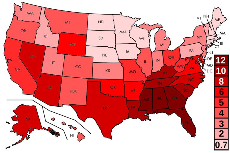Keywords: Map of US Murder Rate in 1945.svg en Map of US murder rate in 1945 http //www cdc gov/nchs/data/vsus/vsrates1940_60 pdf Data pgs 661 662 See File Map of US Murder Rate in 1940 svg for data 2016-04-01 own Delphi234 other versions cc-zero Maps of crime statistics for the United States |