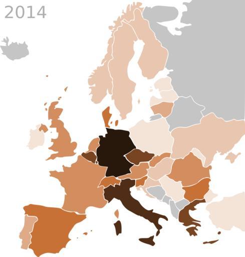 | Keywords: MapEuropeSmall WattPerCapita 2014.svg animation PV per-capita distribution in Europe since 1992 Legend figures in watts per capita inhabitant C5C5C5 1px solid 9E9E9E <0 1 n/a F4E3D7 1px solid E5B99A 0 1 “1 watt E9C6AF 1px solid D99C73 1 “10 watts DEAA87 1px solid CE7F4B 10 “50 watts D38D5F 1px solid B46631 50 “100 watts C87137 1px solid 8C4F26 100 “150 watts A05A2C 1px solid 64381B 150 “200 watts 784421 1px solid 3C2310 200 “300 watts 502D16 1px solid 140C05 300 “450 watts 28170B 1px solid 28170B 450 “600 watts own SourceË http //www iea-pvps org/fileadmin/dam/public/report/technical/PVPS_report_-_A_Snapshot_of_Global_PV_-_1992-2014 pdf IEA-PVPS snapshot report p 15 March 2015 http //www webcitation org/6XPpb1fai archive http //www energies-renouvelables org/observ-er/stat_baro/observ/EurObservER-barojdpv13-Photovoltaic-Barometer-2015-EN pdf PV Barometer report pp 7 “10 April 2015 Map needs to be finalized with 2014-figure from EPIA <div style background-color f2f2f2; color 333; border 1px solid ccc; margin 5px 15px; padding 10px; font-size 0 85em; max-width 450px; >Color changes in map for 2014 watt-per-capita 2013 †’2014 <span style background-color FFD9B3; >Cyprus</span> 28 †’ 75 5 W/cap not on map's scope <span style background-color FFFFB3; >Denmark</span> 97 †’ 107 4 W/cap <span style background-color FFFFB3; >Germany</span> 443 †’ 474 0 W/cap <span style background-color FFFFB3; >Italy</span> 299 †’ 308 4 W/cap <span style background-color FFD9B3; >Luxembourg</span> 172 8 †’ 200 1 W/cap <span style background-color FFD9B3; >Malta</span> 66 3 †’ 127 5 W/cap not displayed on map Moldova</span> none †’ 0 1 W/cap G G Solar 1 330 kW PV project in Chisinau 2 February 2014 <span style background-color FFFFB3; >Netherlands</span> 39 †’ 66 8 W/cap <span style background-color FFFFB3; >Norway</span> 0 1-1 †’ 2 6 W/cap Serbia</span> 0 †’ 0 1 W/cap opening 1 MW solar park <span style background-color FFFFB3; >Switzerland</span> 91 †’ 133 3 W/cap Sources <span style background-color FFFFB3; >IEA-PVPS snapshot March 2015</span> and <span style background-color FFD9B3; >PV Barometer April 2015</span> </div> <center> <table cellspacing 1 cellpadding 3 style text-align right;background-color ccc; font-size 0 85em; width 425px; > <tr style text-align center; ><th colspan 5 style text-align center;background-color 333; color white; >Data table ” Watts Per Capita Calculation In 2014</th><tr> <tr style text-align center; > <th>Country</th> <th>Capacity<br />2014</th> <th>Added<br />2014</th> <th>Popultaion</th> <th>Watts per<br />Capita</th> </tr><tr style background-color white; > <td style text-align left; > Austria Austria </td><td> 766 </td><td> 140 </td><td>8 477 000</td><td>90 <small>4</small></td> </tr><tr style background-color f2f2f2; > <td style text-align left; > Belgium Belgium </td><td> 3074 </td><td>65 </td><td>11 162 000</td><td>275 <small>4</small></td> </tr><tr style background-color white; > <td style text-align left; > Bulgaria Bulgaria </td><td> 1 022 </td><td>2 </td><td>7 261 000</td><td>140 <small>8</small></td> </tr><tr style background-color f2f2f2; > <td style text-align left; > Croatia Croatia </td><td> 34 2 </td><td> 14 2 </td><td>4 253 000</td><td>8 <small>1</small></td> </tr><tr style background-color white; > <td style text-align left; > Cyprus Cyprus </td><td> 64 8 </td><td> 30 </td><td>1 141 000</td><td>75 <small>5</small></td> </tr><tr style background-color f2f2f2; > <td style text-align left; > Czech Republic Czech Republic </td><td>2 134 </td><td>2 </td><td>10 520 000</td><td>202 <small>9</small></td> </tr><tr style background-color white; > <td style text-align left; > Denmark Denmark </td><td>603 </td><td>39 </td><td>5 612 000</td><td>107 <small>4</small></td> </tr><tr style background-color f2f2f2; > <td style text-align left; > Estonia Estonia </td><td>0 2 </td><td>0 1 </td><td>1 283 000</td><td>0 <small>6</small></td> </tr><tr style background-color white; > <td style text-align left; > Finland Finland </td><td>10 </td><td>0 </td><td>5 436 000</td><td>1 <small>9</small></td> </tr><tr style background-color f2f2f2; > <td style text-align left; > France France </td><td>5 660 </td><td>927 </td><td>66 475 000</td><td>85 <small>1</small></td> </tr><tr style background-color white; > <td style text-align left; > Germany Germany </td><td>38 200 </td><td>1 900 </td><td>80 586 000</td><td>474 <small>0</small></td> </tr><tr style background-color f2f2f2; > <td style text-align left; > Greece Greece </td><td>2 595 </td><td>16 </td><td>11 030 000</td><td>235 <small>3</small></td> </tr><tr style background-color white; > <td style text-align left; > Hungary Hungary </td><td>38 2 </td><td>3 2 </td><td>9 894 000</td><td>3 <small>9</small></td> </tr><tr style background-color f2f2f2; > <td style text-align left; > Ireland Ireland </td><td>1 1 </td><td>0 1 </td><td>4 595 400</td><td>0 <small>7</small></td> </tr><tr style background-color white; > <td style text-align left; > Italy Italy </td><td>18 460 </td><td>385 </td><td>59 862 000</td><td>308 <small>4</small></td> </tr><tr style background-color f2f2f2; > <td style text-align left; > Latvia Latvia </td><td>1 5 </td><td>0 </td><td>2 011 000</td><td>0 <small>8</small></td> </tr><tr style background-color white; > <td style text-align left; > Lithuania Lithuania </td><td>68 1 </td><td>0 1 </td><td>2 956 000</td><td>23 <small>1</small></td> </tr><tr style background-color f2f2f2; > <td style text-align left; > Luxembourg Luxembourg </td><td>110 </td><td>15 </td><td>543 000</td><td>200 <small>1</small></td> </tr><tr style background-color white; > <td style text-align left; > Malta Malta </td><td>54 </td><td>26 </td><td>423 000</td><td>127 <small>5</small></td> </tr><tr style background-color f2f2f2; > <td style text-align left; > Netherlands Netherlands </td><td>1 123 </td><td>400 </td><td>16 800 000</td><td>66 <small>8</small></td> </tr><tr styl