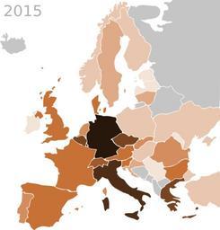 Keywords: MapEuropeSmall WattPerCapita 2015.svg animation PV per-capita distribution in Europe since 1992 Legend figures in watts per capita inhabitant legend C5C5C5 1px solid 9E9E9E <0 1 n/a F4E3D7 1px solid E5B99A 0 1 “1 watt E9C6AF 1px solid D99C73 1 “10 watts DEAA87 1px solid CE7F4B 10 “50 watts D38D5F 1px solid B46631 50 “100 watts C87137 1px solid 8C4F26 100 “150 watts A05A2C 1px solid 64381B 150 “200 watts 784421 1px solid 3C2310 200 “300 watts 502D16 1px solid 140C05 300 “450 watts 28170B 1px solid 28170B 450 “600 watts own Sources Tentative estimates from several online sources and calculated base on 2014-figures from EPIA IEA-PVPS PV Barometer Projections incomplete and in an early stage http //www solarserver com/solar-magazine/solar-news/current/2015/kw18/ihs-solar-analysts-at-snec-global-solar-pv-demand-grows-by-up-to-30-need-for-energy-storage-rises html Top solar PV markets in 2015 according to IHS <div style background-color f2f2f2; color 333; border 1px solid ccc; margin 5px 15px; padding 10px; font-size 0 85em; max-width 950px; >Color changes in map for 2015 watt-per-capita 2014 †’2015 Austria 90 †’ 120 Croatia 8 †’ 12 France 85 †’ 105 Netherlands 67 †’ 95 unchanged Poland 0 7 †’ 1 x Portugal 37 †’ 55 Slovakia 98 5 †’ 99 5 unchanged Slovenia 126 †’ 135 unchanged Sweden 8 2 †’ 15 Switzerland 133 †’ 160 Turkey 0 8 †’ 3 United Kingdom 79 6 †’ 125 Check n/a <0 1 for Macedonia Albania Monte Negro Bosnia-Herzegovina Iceland Belarus and Russia Color-scale and HEXcode C5C5C5 1px solid 9E9E9E <0 1 †’ <code> C5C5C5</code> F4E3D7 1px solid E5B99A 0 1 “1  †’ <code> F4E3D7</code> E9C6AF 1px solid D99C73 1 “10  †’ <code> E9C6AF</code> DEAA87 1px solid CE7F4B 10 “50   †’ <code> DEAA87</code> D38D5F 1px solid B46631 50 “100 †’ <code> D38D5F</code> C87137 1px solid 8C4F26 100 “150 †’ <code> C87137</code> A05A2C 1px solid 64381B 150 “200 †’ <code> A05A2C</code> 784421 1px solid 3C2310 200 “300 †’ <code> 784421</code> 502D16 1px solid 140C05 300 “450 †’ <code> 502D16</code> 28170B 1px solid 28170B 450 “600 †’ <code> 28170B</code> </div> <center> <table cellspacing 1 cellpadding 3 style text-align right;background-color ccc; font-size 0 85em; width 425px; > <tr style text-align center; ><th colspan 5 style text-align center;background-color 333; color white; >Data table ” Watts Per Capita Calculation In 2014</th><tr> <tr style text-align center; > <th>Country</th> <th>Capacity<br />2014</th> <th>Added<br />2014</th> <th>Popultaion</th> <th>Watts per<br />Capita</th> </tr><tr style background-color white; > <td style text-align left; > Austria Austria </td><td> 766 </td><td> 140 </td><td>8 477 000</td><td>90 <small>4</small></td> </tr><tr style background-color f2f2f2; > <td style text-align left; > Belgium Belgium </td><td> 3074 </td><td>65 </td><td>11 162 000</td><td>275 <small>4</small></td> </tr><tr style background-color white; > <td style text-align left; > Bulgaria Bulgaria </td><td> 1 022 </td><td>2 </td><td>7 261 000</td><td>140 <small>8</small></td> </tr><tr style background-color f2f2f2; > <td style text-align left; > Croatia Croatia </td><td> 34 2 </td><td> 14 2 </td><td>4 253 000</td><td>8 <small>1</small></td> </tr><tr style background-color white; > <td style text-align left; > Cyprus Cyprus </td><td> 64 8 </td><td> 30 </td><td>1 141 000</td><td>75 <small>5</small></td> </tr><tr style background-color f2f2f2; > <td style text-align left; > Czech Republic Czech Republic </td><td>2 134 </td><td>2 </td><td>10 520 000</td><td>202 <small>9</small></td> </tr><tr style background-color white; > <td style text-align left; > Denmark Denmark </td><td>603 </td><td>39 </td><td>5 612 000</td><td>107 <small>4</small></td> </tr><tr style background-color f2f2f2; > <td style text-align left; > Estonia Estonia </td><td>0 2 </td><td>0 1 </td><td>1 283 000</td><td>0 <small>6</small></td> </tr><tr style background-color white; > <td style text-align left; > Finland Finland </td><td>10 </td><td>0 </td><td>5 436 000</td><td>1 <small>9</small></td> </tr><tr style background-color f2f2f2; > <td style text-align left; > France France </td><td>5 660 </td><td>927 </td><td>66 475 000</td><td>85 <small>1</small></td> </tr><tr style background-color white; > <td style text-align left; > Germany Germany </td><td>38 200 </td><td>1 900 </td><td>80 586 000</td><td>474 <small>0</small></td> </tr><tr style background-color f2f2f2; > <td style text-align left; > Greece Greece </td><td>2 595 </td><td>16 </td><td>11 030 000</td><td>235 <small>3</small></td> </tr><tr style background-color white; > <td style text-align left; > Hungary Hungary </td><td>38 2 </td><td>3 2 </td><td>9 894 000</td><td>3 <small>9</small></td> </tr><tr style background-color f2f2f2; > <td style text-align left; > Ireland Ireland </td><td>1 1 </td><td>0 1 </td><td>4 595 400</td><td>0 <small>7</small></td> </tr><tr style background-color white; > <td style text-align left; > Italy Italy </td><td>18 460 </td><td>385 </td><td>59 862 000</td><td>308 <small>4</small></td> </tr><tr style background-color f2f2f2; > <td style text-align left; > Latvia Latvia </td><td>1 5 </td><td>0 </td><td>2 011 000</td><td>0 <small>8</small></td> </tr><tr style background-color white; > <td style text-align left; > Lithuania Lithuania </td><td>68 1 </td><td>0 1 </td><td>2 956 000</td><td>23 <small>1</small></td> </tr><tr style background-color f2f2f2; > <td style text-align left; > Luxembourg Luxembourg </td><td>110 </td><td>15 </td><td>543 000</td><td>200 <small>1</small></td> </tr><tr style background-color white; > <td style text-align left; > Malta Malta </td><td>54 </td><td>26 </td><td>423 000</td><td>127 <small>5</small></td> </tr><tr style background-color f2f2f2; > <td style text-align left; > Netherlands Netherlands </td><td>1 123 </td><td>400 </td><td>16 800 000</td><td>66 <small>8</small></td> </tr><tr style background-co