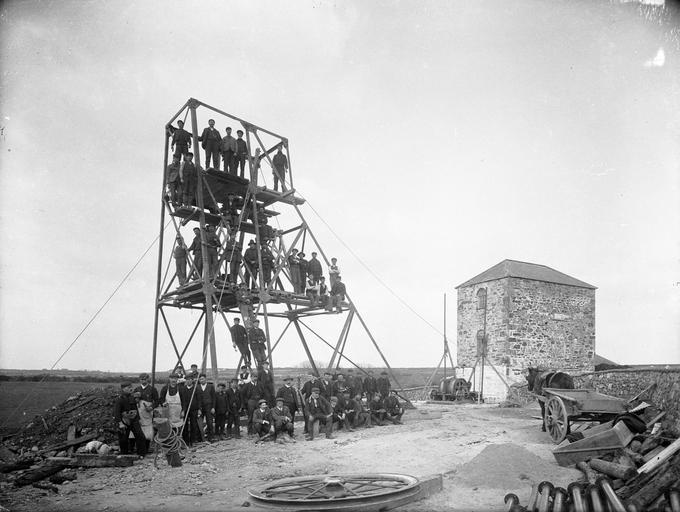 Keywords: mines mining workers bonmahon bunmahon ireland munster wednesday 28th march 1906 1900s a.h. poole ahpoole arthur henri poole arthurhenripoole poole collection poolecollection glass negative glassnegative carpenters mallet gouge chisel theodolite steam powered sinking winch steampoweredsinkingwinch sinking winch sinkingwinch copper mining coppermining copper headstocks winding wheel windingwheel winding house windinghouse ore winches waterford national library of ireland nationallibraryofireland knockmahon bonivy mine bonivymine tankardstown bunmahon copper mines development syndicate bunmahoncopperminesdevelopmentsyndicate h.t. marks htmarks monochrome blackandwhite outdoor black and white Workers standing above on a cage (above a pit opening?) at Knockmahon, Co. Waterford. Date: Wednesday, 28 March 1906 NLI Ref.: P_WP_1556 Workers standing above on a cage (above a pit opening?) at Knockmahon, Co. Waterford. Date: Wednesday, 28 March 1906 NLI Ref.: P_WP_1556 |