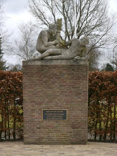 Keywords: Marechausseemonument - Henk Etienne (Apeldoorn).jpg nl Marechausseemonument 1949 gemaakt door Henk Etienne Bakstenen sokkel met natuurstenen sculptuur Herdenkt hen die vielen in de tweede wereldoorlog van Koninklijke Marechausse Korps Politietroepen en Korps Militaire Politie Beeldt een stervende man uit die de vlam van de vrede overdraagt op een andere man own Erik Wannee 2011-02-05 Apeldoorn Frankenlaan tegenover Koning Willem III kazerne 1720 Statues in Apeldoorn World War II memorials in Apeldoorn Henk Etienne Koning Willem III kazerne Cc-zero |