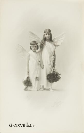 Keywords: Margit och Erik von Geijer utklädda till änglar, 1915 - Hallwylska museet - 107986.tif LSH artwork sv FOTOGRAFIER m m FRÅN JULAFTNAR firade med familjen von Geijer 1 Från år 1913 på Wegeholm Fotografi Av Margit och Erik von Geijer som småbarn I högra nedre hörnet signerat Emil Bruno Hälsingborg Höjd 19 cm; bredd 11 cm Gåva till Wilhelmina von Hallwyl januari eller februari 1914 från hennes dotter Irma 2 Från år 1914 på Wegeholm Julgransflagga svensk Av silkespapper med stång av ståltråd Längs korsets horisontala del med svart bläck skrivet Hopp och Trohet Jul 1914 Längd 13 cm bredd 7 cm Stång längd 12 cm Gåva till Walther von Hallwyl Julaftonen 1914 från hans dotterdotter och dotterson Margit och Erik von Geijer Julgransflagga svensk och två fotografier Flagga Som den nyss beskrivna Fotografier På kort 1 Margit von Geijer som Svea stående med utslaget hår i fotsid vit dräkt med slöja pannband mörkt axelband och sandaler i högra handen Sveriges flagga med stången stödd mot marken i vänstra handen riksskölden med Lilla riksvapnet Tre kronor På kort 2 Erik von Geijer som tomte På båda i högra nedre hörnet signerat Emil Bruno Hälsingborg Kort 1 höjd 17 5 cm bredd 7 5 cm Kort 2 höjd 17 7 cm bredd 7 5 cm Gåva till Wilhelmina von Hallwyl Julaftonen 1914 från hennes dotterdotter och dotterson Margit och Erik von Geijer För beskrivning av julfirandet på Wegeholm se detta inv nummer i katalogverket Flaggorna inköpta av Irma von Geijer hos en handlare i Hälsingborg Fotografierna tagna Januari 1915 hos fotografen Emil Bruno Helsingborg 3 Från år 1915 på Wegeholm Solros Helianthus Av silkespapper och sammet med stjälk av ståltråd Blomkorg av gult kräpperat papper samt brun sammet stjälken lindad med grönt papper med foderblad och tre stjälkblad av dylikt papper Stjälk längd 31 cm Blomma diameter 14 cm Gåva till Walther von Hallwyl Julaftonen 1915 från hans dotterdotter och dotterson Margit och Erik von Geijer Solros Helianthus och två fotografier Solros Som den nyss beskrivna Fotografier På kort 1 Margit och Erik von Geijer stående hand i hand; båda klädda till änglar I högra nedre hörnet signerat Emil Bruno Hälsingborg Höjd 11 8 cm bredd 16 7 cm På kort 2 Samma barn stående i de s k arkaderna framför en dörr på Wegeholms borg samt hållande i dragstången till en blomstersmyckad liten vagn; båda klädda som på kort 1 Gåva till Wilhelmina von Hallwyl f Kempe julaftonen 1915 från Margit och Erik Geijer För detaljer om julfirandet se detta inv nr i katalogverket Fotografierna tagna Februari 1916 av fotografen Emil Bruno Helsingborg 4 Från år 1916 på Wegeholm Docka Lockigt ljusgult hår blåa ögon och röda läppar; clownkostym med bred krage och toppig mössa; på kostymen stora blåa rosetter av silkespapper Längd utan mössa 16 5 cm Mössa höjd 3 8 cm Gåva till Walther von Hallwyl julaftonen 1916 från Margit och Erik von Geijer Docka och fotografi Docka Som den nyss beskrivna Fotografi Margit och Erik von Geijer som Pierrette och Pierrot I högra nedre hörnet signerat Emil Bruno Hälsingborg Höjd 17 9 cm Bredd 12 4 cm Gåva till Wilhelmina von Hallwyl f Kempe Julaftonen 1916 från Margit och Erik von Geijer För detaljer om julfirandet se detta inv nr i katalogverket 5 Från år 1917 i Hamngatan 4 Stockholm Stjärna med spira Stjärna av guldpapper spira av trä Längd 34 5 cm Stjärna diameter 12 cm Spira längd 25 cm Gåva till Walther von Hallwyl Julaftonen 1917 från Margit och Erik von Geijer För detaljer om julfirandet se detta inventarienummer i katalogverket Fotografien tagen Februari 1918 av fotografen Herm Hamnqvist Atelier Bruno Södra Storgatan 3 Helsingborg 6 Från år 1918 i Hamngatan 4 Stockholm Penséer två stycken Av vitt s k engelskt skinn bomullssatin med stjälk av ståltråd Pressade samt handmålade i färger den ena med vit och den andra med gul mitt; stjälkarna gröna lindade med tyg som blommorna vardera med ett grönt stjälkblad Längd omkring 18 cm Gåva till Walther von Hallwyl julaftonen 1918 från Margit och Erik von Geijer Penséer två stycken och fotografi Penséer Som de nyss beskrivna Fotografi Margit och Erik von Geijer stående klädda till penséer Till höger om bilderna signerat Ferd Flodin -19 Höjd 22 8 cm Bredd 14 5 cm Gåva till Wilhelmina von Hallwyl Julaftonen 1918 från Margit och Erik von Geijer Penséerna inköpta av Irma von Geijer hos en handlare i Helsingborg Fotografien tagen 28 December 1918 av fotografen Ferd Flodin Hamngatan 3 A Stockholm 7 Från år 1919 i Hamngatan 4 Stockholm Snöboll Av vit bomullsvadd Oregelbundet klotrund utanpå beströdd med frostliknande silverglitter samt utan snöre Genomskärning omkring 4 cm Gåva till Walther von Hallwyl Julaftonen 1919 från Margit och Erik von Geijer Snöboll och fotografi Snöboll Som den nyss beskrivna Fotografi Margit och Erik von Geijer stående vända halvt åt vänster Den förstnämnda till höger båda i stor rund mössa och lång kappa av vadd med glitter samt vita strumpor; framför figurerna två stora snöbollar I högra nedre hörnet signerat Brink Foto Höjd 16 6 cm Bredd 11 2 cm Gåva till Wilhelmina von Hallwyl f Kempe julaftonen 1919 från Margit Johanna och Erik von Geijer För detaljer om julfirandet se detta inv nr i katalogverket Snöbollarna inköpta av Irma von Geijer i Buttericks Mönsteraffär Stockholm Fotografien tagen Januari 1920 av fotografen Gustaf Brink Ängelholm 8 Från år 1920 i Hamngatan 4 Stockholm Skogstomte I form av en brandgul flugsvamp Av tyg bommullsvadd och trä m m Höjd 10 8 cm Hatt diameter 9 1 cm Fotplatta diameter 5 9 cm Gåva till Walther von Hallwyl Julaftonen 1920 från Margit och Erik von Geijer Skogstomte och fotografi Skogstomte Som den nyss beskrivna men röd med vita plättar på svamphatten på kortet vid högra änden målat ett paket under en drypande lacktång Fotografi Margit och Erik von Geijer samt Elionore Joseph alla ståe