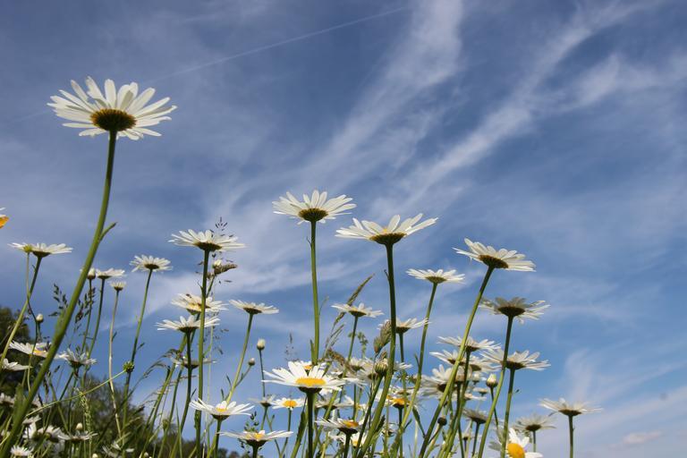 Keywords: marguerite leucanthemum composites asteraceae flower spring summer blossom bloom white bloom sky blue sky beams nature allgäu germany