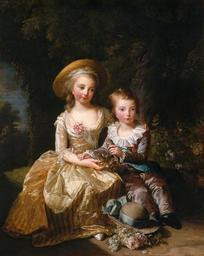 Keywords: Marie Antoinette Children.jpg Artwork Princess Marie Thérèse Charlotte of France Madame Royale and her younger brother Louis Joseph Xavier of France Dauphin of France the eldest children of King Louis XVI of France and Queen Marie Antoinette of France grandchildren of Empress Maria Theresia of Austria and Holy Roman Emperor Franz I Stephan of Lorraine 1784 Oil on canvas cm 132 94 Institution Versailles 1 Petit appartement de la reine chambre vert Palace of Versailles 000PE007449 other versions <gallery>Marie Antoinette Children1 jpg</gallery> PD-old-100 DEFAULTSORT 1784; Bourbon children Portrait paintings by Élisabeth Vigée-Lebrun French royalty 18th-century portrait paintings in the Musée national du Château de Versailles Petit appartement de la reine Versailles first floor z Marie Thérèse Charlotte of France Madame Royale Louis-Joseph Dauphin of France 1784 oil on canvas paintings in France Portrait 1784 portrait paintings from France M 18th-century family portraits of royalty 18th-century oil portraits of children at full length Portrait paintings of girls wearing hats Portrait paintings of sitting children Portraits of siblings Portraits with 2 persons Portraits with natural background Rococo portraits Skeleton suits Striped clothing in art Women facing right in art