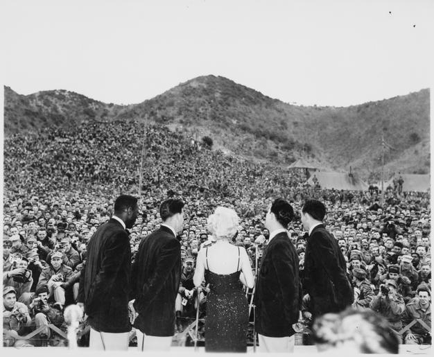 | Keywords: Marilyn Monroe sings several songs for an estimated 13,000 men of the First Marine Division. Miss Monroe stopped at... - NARA - 532471.tif Scope and content General notes Use War and Conflict Number 1467 when ordering a reproduction or requesting information about this image 532471 Local identifier 127-N-A365478 Department of Defense Department of the Navy U S Marine Corps 09/18/1947 - Still Picture Records Section Special Media Archives Services Division NWCS-S National Archives at College Park 8601 Adelphi Road College Park MD 20740-6001 1954-02-16 Record group Record Group 127 Records of the U S Marine Corps 1775 - 9999 Record group ARC 456 General Photograph File of the U S Marine Corps compiled 1927 - 1981 documenting the period 1775 - 1981 Series ARC 532396 File unit File unit ARC Variant control numbers NAIL Control Number NWDNS-127-N-A365478 yes Other versions NARA-cooperation PD-USGov Marilyn Monroe and the USO 1st Marine Division United States in the Korean War |
