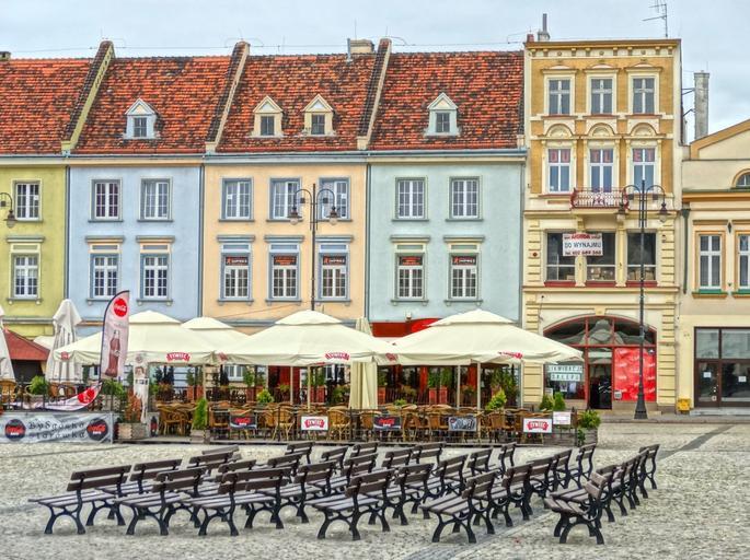 Keywords: market square bydgoszcz poland parasols cafes restaurants buildings historic