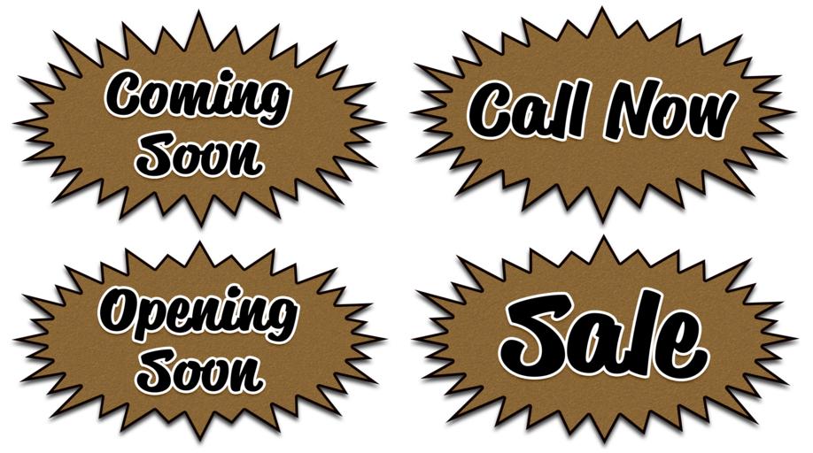 | Keywords: marketing sales promotions advertising sticker banner burst discount event commerce for sale merchandise offer announcement buy sell shop notice retail ad gold black text call out coming soon coming soon now open opening opening soon promote business |