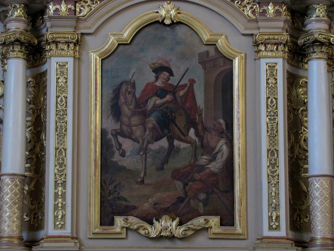 Keywords: Marmoutier Abbaye 224.JPG Alsace Bas-Rhin Marmoutier Église abbatiale Saint-Etienne Tableau de l'autel secondaire St-Martin XVIIIe own 2013 Ralph Hammann cc-by-sa-3 0 Artwork / Œuvre d'art / Kunstwerk Artist Charité de saint Martin le saint à cheval coiffé d'un chapeau à plumes partage son manteau rouge avec le mendiant assis devant une porte fortifiée circa 1730 oil canvas 110 cm de large Abbatiale Saint-Etienne Marmoutier Autel secondaire de Saint-Martin IM67011788 object history other versions Ralph Hammann PD-old accession number Photographs of Marmoutier by Ralph Hammann Taken with Canon PowerShot SX20 IS Autel de Saint-Martin Marmoutier Baroque church paintings in Alsace 18th-century church paintings in Alsace Objets monuments historiques in Bas-Rhin church paintings Paintings of Saint Martin of Tours Saint Martin and the beggar |