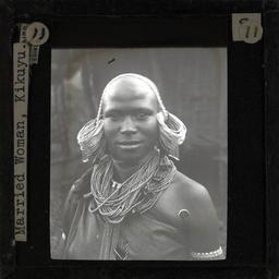 Keywords: Married Woman, Kikuyu, Kenya, ca.1905-ca.1940 (imp-cswc-GB-237-CSWC47-LS7-011).jpg en <br> Married Woman Kikuyu Kenya ca 1905-ca 1940 Portrait photograph of a married Kikuyu woman The woman is heavily decorated with jewellery round her neck and arms and is wearing a headdress The portrait image is head and shoulders only and is in black and white ; This belongs to a series of Church of Scotland Foreign Missions Committee lantern slides relating to the Kikuyu Mission in Kenya which was set up by Church of Scotland missionaries Hospitals were established by Scottish missionaries in Kikuyu in 1908 in Tumutumu in 1909 and in Chogoria in 1922 The missionaries also introduced the Presbyterian Church to the area The Kikuyu are Kenyaas most populous ethnic group Photographer Unknown Filename imp-cswc-GB-237-CSWC47-LS7-011 tif Coverage date 1905/1940 Part of collection International Mission Photography Archive ca 1860-ca 1960 Type images Part of subcollection Photographs from the Centre for the Study of World Christianity University of Edinburgh U K ca 1900-ca 1940s Repository name Centre for the Study of World Christianity Archival file impaunpub_Volume7/1623 url Repository address The University of Edinburgh School of Divinity New College Mound Place Edinburgh EH1 2LX United Kingdom Geographic subject country Kenya Format aacr2 1 lantern slide 8 x 8 cm Geographic subject continent Africa Rights Contact the repository for details Part of series Kenya Mission LS7 Repository email divinity-CSWC ed ac uk Subject lcsh Keyword Women; Clothing and dress Date created 1905/1940 Publisher of the digital version University of Southern California Libraries Subject aat genre portraits Format aat lantern slides Legacy record ID impa-m68728 Access conditions http //www ed ac uk/schools-departments/divinity/research/centres/world-christianity/collections-resources File GB 237 CSWC47/LS7/11 1905/1940 author http //digitallibrary usc edu/cdm/ref/collection/p15799coll123/id/64743 PD-old-70-1923 Magic lantern images Images from USC Digital Library uploaded by Fæ International Mission Photography Archive ca 1860-ca 1960 Women of Kenya Jewellery