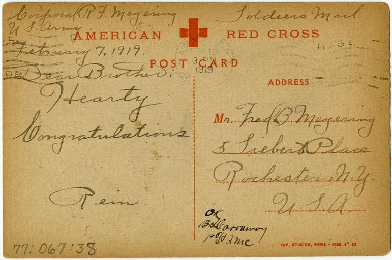 Keywords: george_eastman_house georgeeastmanhouse armistice day armisticeday soldiers mail soldiersmail post card postcard carte postale cartepostale red cross redcross fred b. meyering fredbmeyering february 7, 1919 february71919 1919 corporal r. j. meyering corporalrjmeyering brother rein france rochester, ny rochesterny post mark postmark american red cross americanredcross u s army usarmy congratulations color:rgb_avg=bfa066 color:rgbavg=bfa066 text document indoor writing Accession Number: 1977:0067:0038v Maker: Unidentified Photographer Title: Marshal FOCH Date: ca. 1915 Medium: photomechanical reproduction Dimensions: Overall: 13.8 x 9.2 cm George Eastman House Collection General – information about the George Eastman House Photography Collection is available at www.eastmanhouse.org/inc/collections/photography.php. For information on obtaining reproductions go to: www.eastmanhouse.org/flickr/index.php?pid=1977:0144:0050MP. Accession Number: 1977:0067:0038v Maker: Unidentified Photographer Title: Marshal FOCH Date: ca. 1915 Medium: photomechanical reproduction Dimensions: Overall: 13.8 x 9.2 cm George Eastman House Collection General – information about the George Eastman House Photography Collection is available at www.eastmanhouse.org/inc/collections/photography.php. For information on obtaining reproductions go to: www.eastmanhouse.org/flickr/index.php?pid=1977:0144:0050MP. |