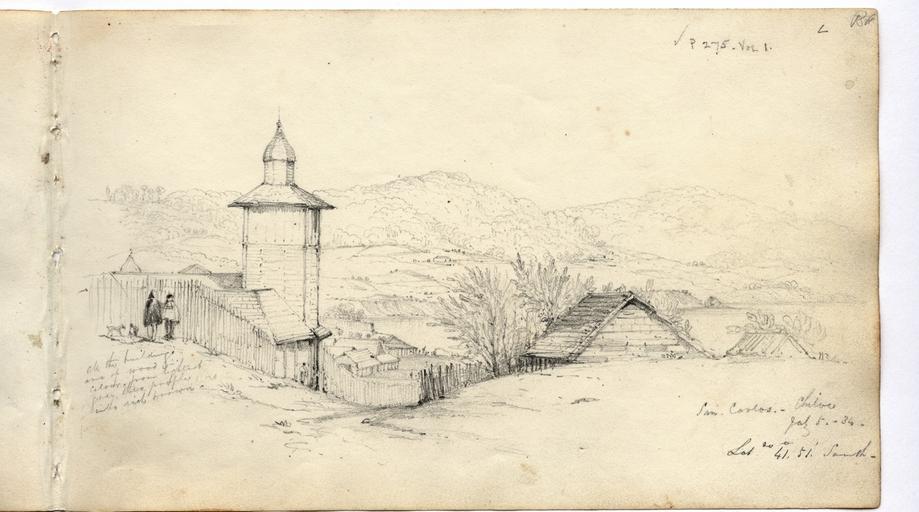 Keywords: Martens, San Carlos, Chiloé Lat, 41 51' South (image 37, page 24r).jpg Drawings and watercolors by Conard Martens from the second voyage of HMS Beagle Sketchbook I with titles and numbers as in Cambridge Digital Library which has more info possibly better zooming option; upper and lower margins cropped; not rotated Cambridge Digital Library http //cudl lib cam ac uk/view/MS-ADD-07984/1 1834 1835 Conrad Martens 1801-1878 PD-scan Originally distributed as CC-BY-NC 3 0 but PD tag is applicable Beagle sketchbook I Chiloé Archipelago Ancud |