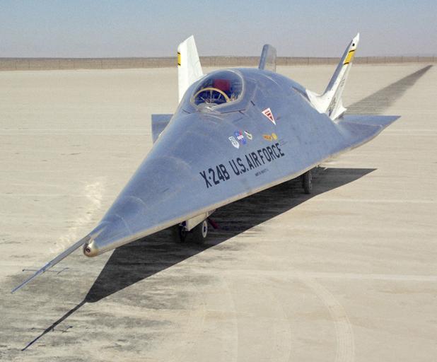 | Keywords: martin marietta x-24b x24b research aircraft nasa usaf lifting body liftingbody outdoor The X-24 was one of a group of lifting bodies flown by the NASA Flight Research Center (now Dryden Flight Research Center) in a joint program with the U.S. Air Force at Edwards Air Force Base in California from 1963 to 1975. The lifting bodies were used to demonstrate the ability of pilots to maneuver and safely land wingless vehicles designed to fly back to Earth from space and be landed like an airplane at a predetermined site. The X-24B's design evolved from a family of potential reentry shapes, each with higher lift-to-drag ratios, proposed by the Air Force Flight Dynamics Laboratory. To reduce the costs of constructing a research vehicle, the Air Force returned the X-24A to the Martin Marietta Corporation (as Martin Aircraft Company became after a merger) for modifications that converted its bulbous shape into one resembling a "flying flatiron" -- rounded top, flat bottom, and a double delta planform that ended in a pointed nose. First to fly the X-24B was John Manke, a glide flight on 1 August 1973. He was also the pilot on the first powered mission 15 November 1973. Photo replaced on 19 Sep 2016 with a larger version. The X-24 was one of a group of lifting bodies flown by the NASA Flight Research Center (now Dryden Flight Research Center) in a joint program with the U.S. Air Force at Edwards Air Force Base in California from 1963 to 1975. The lifting bodies were used to demonstrate the ability of pilots to maneuver and safely land wingless vehicles designed to fly back to Earth from space and be landed like an airplane at a predetermined site. The X-24B's design evolved from a family of potential reentry shapes, each with higher lift-to-drag ratios, proposed by the Air Force Flight Dynamics Laboratory. To reduce the costs of constructing a research vehicle, the Air Force returned the X-24A to the Martin Marietta Corporation (as Martin Aircraft Company became after a merger) for modifications that converted its bulbous shape into one resembling a "flying flatiron" -- rounded top, flat bottom, and a double delta planform that ended in a pointed nose. First to fly the X-24B was John Manke, a glide flight on 1 August 1973. He was also the pilot on the first powered mission 15 November 1973. Photo replaced on 19 Sep 2016 with a larger version. |
