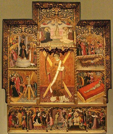 Keywords: Martorell-Vicenc.jpg Bernat Martorell - Altarpiece of Saint Vincent - Google Art Project jpg Retaule de Sant Vicenç Altarpiece of Saint Vincent Creator Bernat Martorell ca 1438 1440 langSwitch Tremp i daurat amb pa d'or sobre fusta Tempera and gold leaf on wood cm 288 238 24 5 Institution Museu Nacional d'Art de Catalunya own provenance provenanceEvent Sant Vicenç de Menàrguens Noguera provenanceEvent 1930 bequest MNAC Ignasi Girona and Anna Jover 015797-CJT museus en línia 696745 Other versions PD-old-100 Bernat Martorell Paintings of Vincent of Saragossa Gothic altarpieces in Catalonia Gothic paintings in the Museu Nacional d'Art de Catalunya |