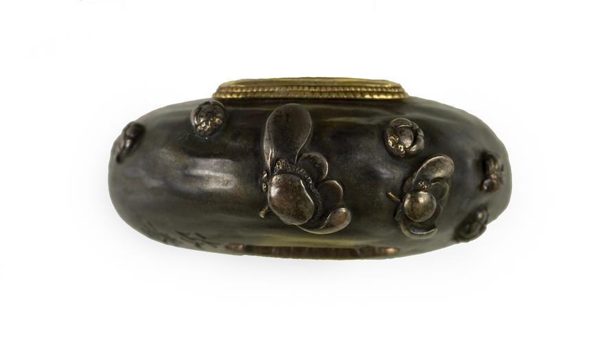 | Keywords: Masaharu - Kurikata with Plum Blossoms - Walters 51915 - Top.jpg Plum blossoms and buds are scattered across the kurikata as though they were blowing in the wind Plums blossoms are the first flowers to bloom after winter and are associated with early spring century 19 Edo shibuichi gold cm 3 4 accession number 51 915 14300 William T / Henry Walters Collection Baltimore date and mode of acquisition unknown Walters Art Museum Henry Walters Acquired by William T or Henry Walters Signature Masaharu place of origin Japan Walters Art Museum license Tosogu Japanese sword fittings in the Walters Art Museum Media contributed by the Walters Art Museum needs category review Masaharu |