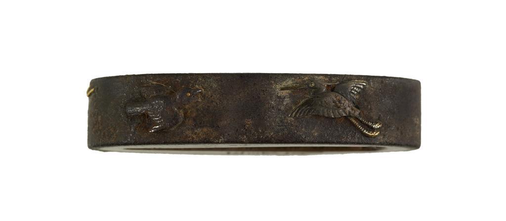 Keywords: Masanaga (a) - Fuchi with a Man Fishing - Walters 51994 - Back.jpg A man is depicted in the prow of a boat fishing with a pole He is wearing a straw hat and straw coat On the reverse a heron and a crow are depicted in flight century 18 Edo iron copper silver gold cm 3 7 accession number 51 994 31301 William T / Henry Walters Collection Baltimore date and mode of acquisition unknown Walters Art Museum Henry Walters Acquired by William T or Henry Walters Signature Masanaga kao place of origin Japan Walters Art Museum license Fuchi in the Walters Art Museum Media contributed by the Walters Art Museum needs category review Masanaga |