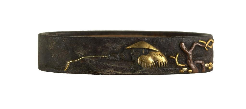 Keywords: Masanaga (a) - Fuchi with a Man Fishing - Walters 51994.jpg A man is depicted in the prow of a boat fishing with a pole He is wearing a straw hat and straw coat On the reverse a heron and a crow are depicted in flight century 18 Edo iron copper silver gold cm 3 7 accession number 51 994 31301 William T / Henry Walters Collection Baltimore date and mode of acquisition unknown Walters Art Museum Henry Walters Acquired by William T or Henry Walters Signature Masanaga kao place of origin Japan Walters Art Museum license Fuchi in the Walters Art Museum Media contributed by the Walters Art Museum needs category review Masanaga |