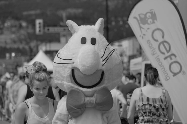 Keywords: blackandwhite black white monochrome mascot street streetphotography summer fun cute canada britishcolumbia bc okanagan kelowna blockparty people girl female cat outdoor downtown