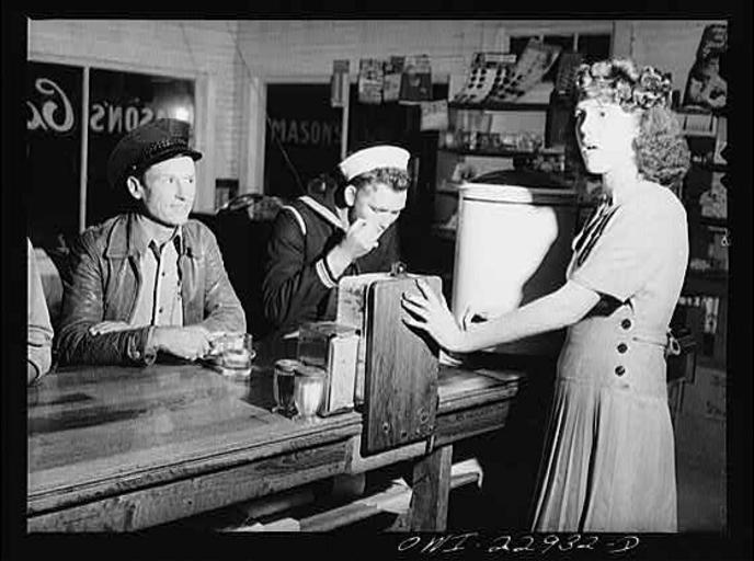 | Keywords: MasonsCafeVachon.jpg Truck driver sailor and waitress at a highway coffee shop on U S Highway 90 in southern Louisiana 1943 Photograph by John Vachon via Library of Congress website at http //lcweb2 loc gov/cgi-bin/query/h pp/PPALL field NUMBER+ band fsa+8d16336 1943-03 Creator John Vachon PD-USGov 1943 in Louisiana John Vachon Cafés in Louisiana U S Route 90 in Louisiana Interiors of restaurants in Louisiana Waitresses Black and white photographs of Louisiana | ||||