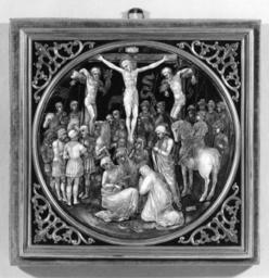 Keywords: Master KIP - The Crucifixion - Walters 44137.jpg The composition includes many figures according to a tradition established by the 14th-century formulation of the Crucifixion in Sienese painting Mounted officials and foot-soldiers mingle in a dense throng above which rise the three crosses The drawing of Christ is of great beauty and reminds one of a Florentine Corpus of the Quattrocento In the foreground at the foot of the cross is the group of holy women huddled around the swooning Virgin watched by St John This is also remarkably executed The diagonal position of the crucified thieves fits well into the roundel An angel in gold hovers near the Good Thief on Christ's right and a demon is drawn in grisaille above the Bad Thief Near the Centurion a gilt scroll soars upward inscribed VERE FILIVS DEI ERAT ISTE Below the horse on the right an open scroll bears the monogram KIP middle Other date century 16 technique painted enamel copper Diam cm 11 1 accession number 44 137 32014 Cardinal Giacomo Antonelli Minister to Pope Pius IX 1806-1876 Rome date and mode of acquisition unknown Family of Cardinal Giacomo Antonelli 1878 by bequest George Robinson Harding London date of acquisition unknown by purchase Henry Walters Baltimore June 17 1904 by purchase Walters Art Museum Henry Walters Acquired by Henry Walters 1904 Transcription VERE FILIVS DEI ERAT ISTE Signature KIP place of origin Limoges France Walters Art Museum license Limoges painted enamels in the Walters Art Museum Master KIP Media contributed by the Walters Art Museum needs category review Painted enamel art in the Walters Art Museum Holy women |
