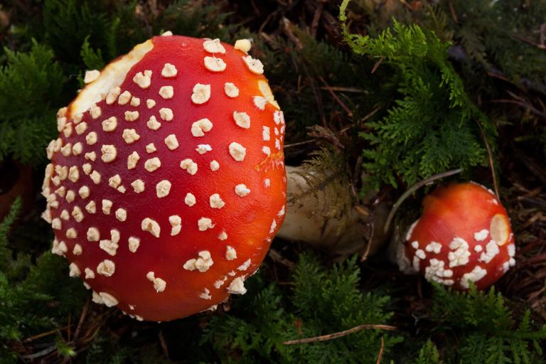 Keywords: matryoshka amanita muscaria small large mushroom hat red signal red flake white velum flakes autumn nature forest moss green forest floor toxic