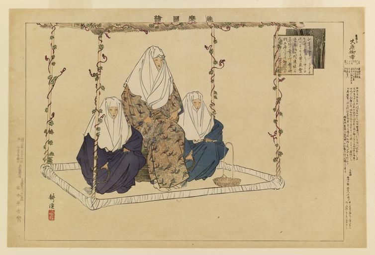 Keywords: Matsuke Heikichi - Nogaku zue - Walters 95247.jpg Walters Art Museum artwork Creator Daikokuya Matsuki Heikichi en The former Empress Kenreimon-in has become a nun and is shown with two companions The framework represents her rustic cottage at a convent in the hills of Kyoto where the Retired Emperor Go-Shirakawa pays her a visit In 1185 at the battle of Dan-no-ura the empress foreseeing defeat had jumped into the sea with her mother and son the child emperor The child and his grandmother drowned but the empress was pulled from the water by an enemy soldier 1899 Meiji pigments mulberry paper cm 25 37 2 accession number 95 247 1530 Mr and Mrs C R Snell Jr date and mode of acquisition unknown Walters Art Museum Gift of Mr and Mrs C R Snell Jr 1989 Signature Kogyo place of origin Tokyo Japan Walters Art Museum license PD-old-auto 1927 2D Japanese prints in the Walters Art Museum Historic samurai prints Daikokuya Matsuki Heikichi Kōgyo Tsukioka |