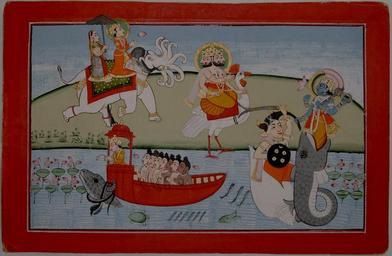 Keywords: Matsya and Manu.jpg en Scene from a Matsya Purana Manu with Seven Rishis in a boat tied by Vasuki to Vishnu; Indra and Brahma show deference to Vishnu as Matsya avatara Mewar circa 1840 1840 http //www indianminiaturepaintings co uk/Mewar_Manu_221111 html author PD-Art Uploaded with UploadWizard Matsya Saptarishi Indra Paintings of Brahma Vasuki Paintings of Devi 1840s paintings from India Animals in art of India |
