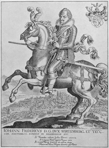 Keywords: Matthäus Merian, Stuttgart, 017.jpg de Reiterbild von Herzog Johann Friedrich von Württemberg mit Ansicht von Stuttgart Radierung von Matthäus Merian 1616 320 x 262 mm Schefold 7788 Gustav Wais Alt-Stuttgart Die ältesten Bauten Ansichten und Stadtpläne bis 1800 Mit stadtgeschichtlichen baugeschichtlichen und kunstgeschichtlichen Erläuterungen Stuttgart 1954 Tafel 7 1616 Creator Matthäus Merian Großes Reiterbild Nach links auf steigendem Pferd sitzt der Herzog gerüstet mit Harnisch in der Rechten das Szepter in der Linken die Zügel Oben rechts das württembergische Wappen Hinten Ansicht der Stadt Stuttgart von Westen Von der Reinsburg aus bietet sich dem Beschauer die ganze Südwestseite der Stadt mit der Mauer vom Pulverturm links über das Rotebildtor den Folterturm und das Seeltor bis zum Hauptstätter Tor In der Mitte die Stiftskirche und das Alte Schloss rechts die Leonhardskirche Vor der Stadt vollzieht sich ein Aufmarsch von Berittenen und Fußvolk wie er zu jener Zeit da Württemberg ein Kontingent an Truppen zum Schwäbischen Kreis zu stellen hatte üblich war Bildunterschrift Iohann Fridericvs D G Dvx Wirtemberg et Tecc Com Montisbelig Dominvs in Haidenheim etc Iohannes Fridericus Dei Gratia Dux Wirtembergensis et Teccensis Comes Montisbeligardensis Dominus in Haidenheim etc Johann Friedrich von Gottes Gnaden Herzog von Württemberg und Teck Graf von Mömpelgard Herr in Heidenheim usw <poem>Si Themidos cultum spectes Pietatis amorem Si Linguas Artes cognita Regna notes Si curam Patriæ trutines et cætera dona Maiorem Hunc Magno dixeris esse Patre</poem> <poem>Wenn du auf die Pflege des Rechts schaust auf Liebe zur Frömmigkeit Wenn du auf Sprachen Künste und Kenntnis der Königreiche achtest Wenn du die Sorge fürs Vaterland und die übrigen Gaben prüfst So wirst du sagen Dieser ist größer als sein großer Vater à bersetzung siehe http //portraits hab de/werk/24236/ </poem> PD-old-100 Historic views of Stuttgart Matthäus Merian ™s Engravings of Stuttgart Duke Johann Friedrich of Württemberg |