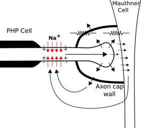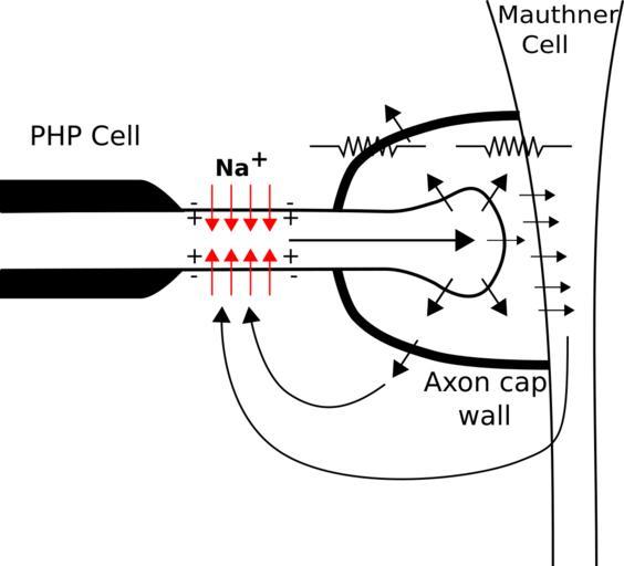 Keywords: Mauthner Cell axon cap schematic.svg en Describes the structure and function of the mauthner cell axon cap The Red arrows represent the influx of sodium ions through VGNaCs along their electrochemical potential depolarising the PHP cell axon Ions passively leave the axon into the axon cap space to balance the charge influx of the sodium current The potential drop by the resistances of the axon cap and membrane hyperpolarize the M cell Though there is an influx of positive charge into the M cell axon hillock the extracellular face of the membrane becomes even more positive leading to a net hyperpolarization own Staticd 2011-07-19 Neurobiology Fish anatomy Electrophysiology |