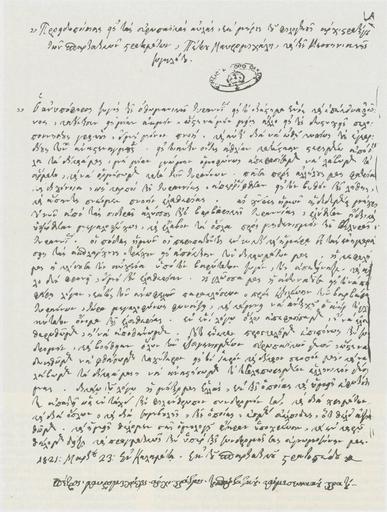 Keywords: Mavromichalis proeidopoiisis eis tas evropaikas avlas 23031821.jpg en An Appeal to the European Courts signed by Petros Mavromichalis and dated 23th of March 1821 el «Προειδο οίησις εις τας ευρω αϊκάς αυλάς» υ ογεγραμμένη α ό τον Πέτρο αυρομιχάλη στις 23 αρτίου 1821 1821-03-23 Ιστορία του Ελληνικού Έθνους τ IB' Η Ελληνική Ε ανάσταση και η ίδρυση του ελληνικού κράτους Αθήνα Εκδοτική Αθηνών 1975 σελ 90 el Ο Πετρόμ εης αυρομιχάλης και η εσσηνιακή Σύγκλητος 23 αρτίου 1821 en Petrobey Mavromichalis and the Messenian Senate March 23 o s 1821 other versions Custom license marker 2016 03 05 PD-old-100 Greek War of Independence Petrobeis Mavromihalis