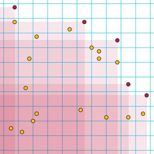 Keywords: Maxima of a point set.svg maxima of the set of all the red and yellow points The shaded regions show the points dominated by each of the five maxima 2016-01-06 own David Eppstein other versions cc-zero Computational geometry Uploaded with UploadWizard