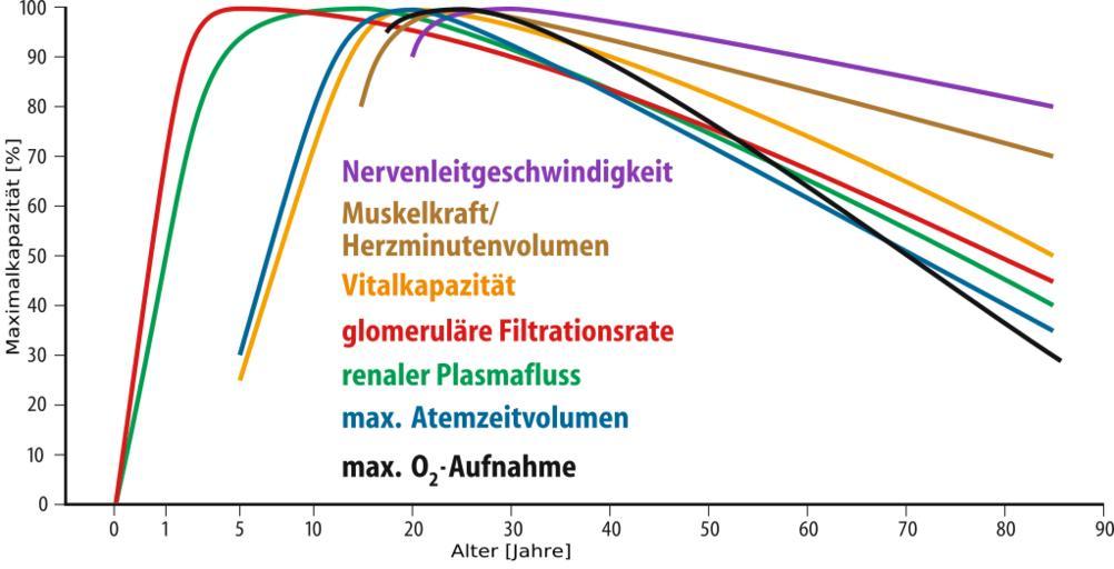Keywords: Maximalkapazitaet 01.svg Physiologische Veränderungen verschiedener Organsysteme in Abhängigkeit vom Alter Die Skala ist im Bereich von 0 bis 10 Jahren nicht linear Daten Source von R F Schmidt F Lang und G Thews Physiologie des Menschen Verlag Springer 2005 ISBN 3-540-21882-3 2005 Seite 940 own inspired by Source 2010-08-12 Kuebi Armin Kübelbeck Gerontology |