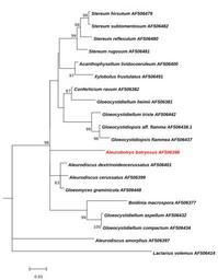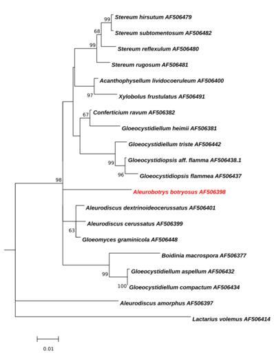 Keywords: Maximum Likelihood -Tree-of-Aleurobotrys and related Taxa.svg Figure Figure Molecular Phylogenetic analysis of Aleurobotrys and related Taxa by Maximum Likelihood method <br/> The evolutionary history was inferred by using the Maximum Likelihood method based on the Kimura 2-parameter model 1 The tree with the highest log likelihood -3361 7056 is shown The percentage of trees in which the associated taxa clustered together is shown next to the branches A user-specified tree was used as an initial tree in the heuristic search A discrete Gamma distribution was used to model evolutionary rate differences among sites 5 categories +G parameter 0 5290 The rate variation model allowed for some sites to be evolutionarily invariable +I 69 0768 sites The tree is drawn to scale with branch lengths measured in the number of substitutions per site The analysis involved 20 nucleotide sequences All positions with less than 95 site coverage were eliminated That is fewer than 5 alignment gaps missing data and ambiguous bases were allowed at any position There were a total of 1171 positions in the final dataset Evolutionary analyses were conducted in http //megasoftware net/ MEGA6 2<br/> 1 Kimura M 1980 A simple method for estimating evolutionary rate of base substitutions through comparative studies of nucleotide sequences Journal of Molecular Evolution 16 111-120 <br/> 2 Tamura K Stecher G Peterson D Filipski A and Kumar S 2013 MEGA6 Molecular Evolutionary Genetics Analysis version 6 0 Molecular Biology and Evolution30 2725-2729 <br/> ; List with GenBank Sequences http //www ncbi nlm nih gov/nuccore/AF506479 Stereum hirsutum AF506479 http //www ncbi nlm nih gov/nuccore/AF506482 Stereum subtomentosum AF506482 http //www ncbi nlm nih gov/nuccore/AF506480 Stereum reflexulum AF506480 http //www ncbi nlm nih gov/nuccore/AF506481 Stereum rugosum AF506481 http //www ncbi nlm nih gov/nuccore/AF506400 Aleurodiscus lividocoeruleus AF506400 http //www ncbi nlm nih gov/nuccore/AF506491 Xylobolus frustulatus AF506491 http //www ncbi nlm nih gov/nuccore/AF506382 Conferticium ravum AF506382 http //www ncbi nlm nih gov/nuccore/AF506381 Gloeocystidiellum heimii AF506381 http //www ncbi nlm nih gov/nuccore/AF506442 Gloeocystidiellum triste AF506442 http //www ncbi nlm nih gov/nuccore/AF506438 Gloeocystidiopsis aff flamma AF506438 http //www ncbi nlm nih gov/nuccore/AF506437 Gloeocystidiopsis flammea AF506437 http //www ncbi nlm nih gov/nuccore/AF506398 Aleurobotrys botryosus AF506398 http //www ncbi nlm nih gov/nuccore/AF506401 Aleurodiscus dextrinoideocerussatus AF506401 http //www ncbi nlm nih gov/nuccore/AF506399 Aleurodiscus cerussatus AF506399 http //www ncbi nlm nih gov/nuccore/AF506448 Gloeomyces graminicola AF506448 http //www ncbi nlm nih gov/nuccore/AF506377 Boidinia macrospora AF506377 http //www ncbi nlm nih gov/nuccore/AF506432 Gloeocystidiellum aspellum AF506432 http //www ncbi nlm nih gov/nuccore/AF506434 Gloeocystidiellum compactum AF506434 http //www ncbi nlm nih gov/nuccore/AF506397 Aleurodiscus amorphus AF506397 http //www ncbi nlm nih gov/nuccore/AF506414 Lactarius volemus AF506414 own 2014-09-01 Thkgk Cc-zero Aleurobotrys botryosus Stereaceae |