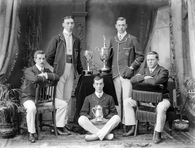 Keywords: five men trophy 1906 group portrait boat club waterford boat club waterfordboatclub may 1900s a.h. poole ahpoole arthur henri poole arthurhenripoole poole collection poolecollection glass negative glassnegative pots austin farrell austinfarrell people identified peopleidentified friday 18th 20th century 20thcentury ireland w.b.c. wbc pierce challenge piercechallenge waterford national library of ireland nationallibraryofireland monochrome groupshot people blackandwhite black and white 5 members of Waterford Boat Club, with their awards. The gentleman seated on the left has been identified by Brendan J. Grogan as his great uncle, Austin Farrell, 1872-1934. Austin Farrell appears also as cox in another Waterford Boat Club photo (circa 1880s?), and in this Waterford Chamber of Commerce photo from May 1930. Date: Friday, 18 May 1906 NLI Ref.: P_WP_1544a 5 members of Waterford Boat Club, with their awards. The gentleman seated on the left has been identified by Brendan J. Grogan as his great uncle, Austin Farrell, 1872-1934. Austin Farrell appears also as cox in another Waterford Boat Club photo (circa 1880s?), and in this Waterford Chamber of Commerce photo from May 1930. Date: Friday, 18 May 1906 NLI Ref.: P_WP_1544a