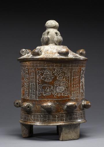 Keywords: Mayan - Lidded Vessel - Walters 20092039 - Side C.jpg The Classic Maya political landscape was divided into more than two dozen polities similar to city-states composed of a primary site plus aligned towns and villages Each was headed by a royal lineage supported by noble families and the polities often competed against each other for political and economic supremacy Feasts sponsored by the ruling elite provided a crucial platform for securing relations among aligned parties and negotiating new alliances Feasts were integral to elaborate affairs of state from rulers' accession rites to royal weddings to war victory celebrations and special religious observances The consumption of large amounts of sumptuous foods including drinks made from highly valued cacao chocolate was a focal point The banquets prompted the production of finely made food-service wares in the form of pictorial pottery their decorative imagery often featuring themes lauding the earthly or supernatural prowess of the host These ornate vessels also functioned as gifts their acceptance signaling the guests' alliance or at least an association with the host The vase's hieroglyphic text confirms its function as a drinking vessel-kakaw yuk'ib or the cacao drinking cup of The text goes on to name the cup's patron/owner at B2 and his father at d1-d2 Chakjal Mukuuy Reddening Dove Neither of these individuals is known from other Early Classic hieroglyphic texts and thus we do not know their political or familial identities Yet the artistic quality of the vessel and its detailed nominal phrase indicate their being members of the nobility if not a royal dynasty of the fourth-fifth centuries The two hieroglyphic texts are separated by pictorial panels featuring the maize god as an embodied cacao tree His bejeweled headdress is topped by a sprouting cacao tree like those adorning the vase's lid Modeled cacao pods embellish the vessel and the lid's knob is a cacao tree with a bird now broken The avian may be the false sun of the previous creation and avatar of the deity Itz'amnaj God D Uniting text and image panels are overlapping bands of cacao leaves The preponderance of cacao imagery supports the interpretation of the text's unusual introductory glyphs a1-b1 as sprouting cacao based on the first sign's resemblance to the vase's sprouting trees see the Maize god's headdress and its sub-fixed sign -la a well-known adjectival element in Maya hieroglyphic writing AD 250-550 Early Classic earthenware slip with incising cm 34 77 22 86 accession number 2009 20 39 80194 Stendahl Galleries Los Angeles date and mode of acquisition unknown John G Bourne 1970s by purchase Walters Art Museum Gift of John Bourne 2009 place of origin Guatemala Walters Art Museum license Maya art in the Walters Art Museum Maya tripod vessels Media contributed by the Walters Art Museum needs category review Maize god |