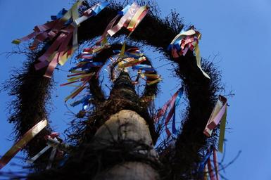 Keywords: maypole flags and pennants tradition custom colorful flags decorated spring village life bavaria need old sky blue