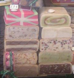 Keywords: Mazapán vasco.jpg en Beautiful coloured marzipans in North Euskadi including one in the form of the Basque flag ca Al País Basc nord es vénen unes barretes petites de 10 a 15 cm de llarg i 1 cm de fruix de massapà tenyit en colors diversos Es produeixen durant tot l'any i són considerades una de les especialitats de la regió De vegades estan decorades amb alguns trossos de fruita seca o confitada Li'n diuen touron el que fa que molts francesos pensin que això és el torró alicantí i que es menja com a postres tot l'any De fet ells els vénen sobretot als turistes francesos que hi van al juliol i a l'agost i el model amb més sortida és el de la bandera basca Aquesta foto està presa a l'agost a Biarritz fr Pâte à massepain paintée et vendu comme torró or turrón aux touristes français own Slastic 2009-08 Food of the Basque Country Marzipan |