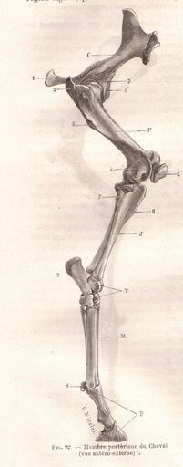 | Keywords: MbrePostChevalChauveau1980.jpg en Antero-external view of the posterior limb of the horse Equus caballus fr Vue antéro-externe d'un membre postérieur de cheval Equus caballus <br /> C os coxal coxal Os Coxae ischium et pubis <br /> F fémur Os femoris <br /> J os de la jambe <br /> T tarse Tarsus basipode du pied <br /> M métacarpe Metacarpus métapode du pied <br /> P phalanges Phalanx acropode du pied <br /> S grands sésamoïdes Ossa sesamoidea phalangis proximalis <br /> 1 ischium ischion Os ischii <br /> 1' pubis Os pubis <br /> 2 tête du fémur Caput ossis femoris <br /> 3 grand trochanter trochanter Trochanter major <br /> 4 troisième trochanter crête ou empreinte sous-trochantérienne Trochanter tertius <br /> 5 condyles du fémur Condylus <br /> 6 rotule Patella <br /> 7 fibula péroné Fibula <br /> 8 tibia Tibia <br /> 9 calcanéus calcanéum Calcaneus <br /> ” Chauveau Auguste Arloing Saturnin Traité d'anatomie comparée des animaux domestiques 1 064 p page 162 1890 Paris Lib J B Baillière et Fils domaine public décès des auteurs 1917 et 1911 Meyer C 2011-03-12 PD-old Horse leg bones Femur |