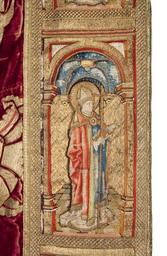 Keywords: MCC-21485 Rode koorkap met verrijzenis op schild, aurifriezen met Bonifatius, Augustinus en Barbara (6).tif Artwork nl onbekend nl Koorkap van wijnrood zijdefluweel waarop met gouddraad grote gestyleerde bloemranken en bladeren geappliceerd zijn Op de rugzijde wordt op een koorkapschild onder drie halfronde baldakijnen met gewelven gescheiden door torentjes en in het midden een roosvenster de Verrijzenis van Christus afgebeeld Centraal op het schild staat Christus verrezen uit het graf gehuld in koormantel met agrafe In de linkerhand houdt hij een kruisvaan met de rechter maakt hij een zegenend gebaar Links van de geopende tombe naderen de drie Maria's Maria Magdalena Maria van Betthanië en een niet nader omschreven Maria Luc 7 36 om Christus' lichaam te balsemen Rechts 'Noli me tangere' 'Wil mij niet aanraken' Joh 20 11-19 waarin Maria Magdalena geknield opziet naar Christus die haar verschijnt als hovenier met een spade in de hand Aan weerskanten van het graf bewakers deels slapend; rechts schrikt een soldaat wakker Links op de achtergrond enkele gebouwen rechts een bergachtig Golgotha waarop de drie kruisen nog zichtbaar zijn De aurifriezen aan de voorkant van de mantel zijn van eerder datum ca 1490 Onder eenvoudige gotische baldakijnen worden tegen een gedamasceerde achtergrond in totaal acht heiligen en bisschoppen afgebeeld van wie er slechts drie middels een attribuut kunnen worden geïdentificeerd Op de linkerstrook wordt bovenaan Barbara uitgebeeld Het loshangend haar hangt over de schouders Ze houdt haar attribuut de toren in de rechterhand Onder Barbara in koormantel paus Cornelius met pausstaf in de linkerhand en tiara op het hoofd Zijn attribuut de hoorn houdt hij in de rechterhand Daaronder een bisschop of kerkvader met de staf in de rechterhand In de linker houdt hij een opengeslagen boek Onderaan weer een bisschop met een dicht boek in de rechterhand en een staf in de linkerhand Op de rechterkolom bovenaan een onbekende bisschop gevolgd door een bisschop die onder de koormantel een maliënkolder draagt Ansfridus Aan zijn voeten een wapenschildmet afwisselend rode en gouden stroken Daaronder de kerkvader Augustinus met zijn attribuut een hart in de linkerhand Rechts houdt hij de bisschopsstaf Onderaan een vierde bisschop of kerkvader die met beide handen een open boek vasthoudt Techniek het opmerkelijke van het weefsel is dat de motieven niet in de stof geweven zijn De gouddraden zijn eerst op een rode katoenen ondergrond gelegd en gehecht en later op het fluweel geappliceerd niet opgehoogd In het borduurwerk op het schild is voor de mantel van Christus en overige kleding de lazuurtechniek toegepast In de architectuur en achtergrond is gebruik gemaakt van deels opgehoogd gehecht en gelegd gouddraad De lichaamspartijen en het graslandschap zijn met zijde in de ingrijpsteek aangebracht De achtergrond van de figuren aan de voorkant van de koorkap is van gelegd en in blokjesmotief gehecht gouddraad Ook in de attributen en de architectuur is gebruik gemaakt van gouddraad De gezichten handen en mantels zijn van zijde in ingrijpsteek De tegelvloertjes zijn van gelegde en met gouddraad gehechte zijde Staat het zijdeborduuwerk aan de voorkant is hier en daar versleten; de gouden draden hangen deels los Staat een deel van de gelegde en met zijde gehechte gouddraden van de applicaties op het weefsel zijn losgeraakt Ook in het borduurwerk zitten enkele losse draden De zoom van de groen zijden voering is voor een groot deel versleten De franje onder aan de koorkap is uit later tijd 17de eeuw between 1490 1519 nl fluweel zijde gouddraad Size 148 322 cm Institution Museum Catharijneconvent place of discovery object history exhibition history credit line nl Foto Museum Catharijneconvent Utrecht foto Ruben de Heer accession number Object number 21485 Inventory number BMH t622 place of creation nl Zuid-Nederland https //www catharijneconvent nl/adlib/21485/ View this work on the website of Museum Catharijneconvent Museum Catharijneconvent Cc-zero Textiles in the Museum Catharijneconvent Media contributed by Museum Catharijneconvent Uploaded with pattypan |