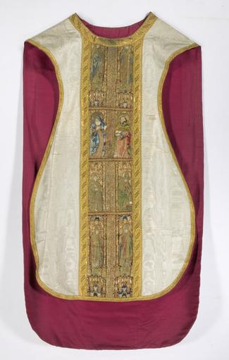 Keywords: MCC-39548 Wit kazuifel met besnijdenis, aanbidding, opdracht in tempel, geboorte en annunciatie (2).tif Artwork nl onbekend nl Het kazuifel is van witte moirézijde De achterzijde bevat vijf geborduurde scenes uit het leven van Christus p de kolom van het kazuifelkruis de Besnijdenis van Christus in een tempelinterieur met ronde bogen Het naakte Christuskind zit op een tafel waarop een kussen links Josef en Maria rechts de hogepriester die de handeling zal gaan verrichten Achter de tafel getuigen en assistenten Boven Christus hangt een brandende godslamp Daaronder de Aanbidding van de drie koningen Maria houdt haar kind op de schoot Koning Melchior ligt geknield voor hem en overhandigd eerbiedig zijn geschenk in goud De gebaarde Balthazar staat in het midden achter hen met zijn geschenk wierook Boven hem straalt de ster van Bethlehem De donkere koning Casper staat op de achtergrond Zijn offergave is de myrrhe De scene speelt zich af in een overwelfde ruimte Door een deuropening is een landschap met kerktorentje zichtbaar Het onderste tafereel verbeeldt de Opdracht in de tempel Maria draagt haar jonggeborene over aan Simeon die hem knielend in ontvangst gaat nemen Jozef staat achter Maria Rechts een vierde figuur De offergave twee tortelduiven zijn zichtbaar achter Christus De tempelruimte is overwelfd; Centraal in een nis staat een beeld van Mozes de stenen tafelen met de tien geboden ophoudend De laatste twee taferelen hebben een opvallend baldakijn Jansen 1948 p 71 met twaalfbladig rozet in medaillon in de boogzwikken De taferelen op de beide zij-armen zijn ingekort Op de linker staat een voorstelling van de Anunciatie De engel Gabriëel links heeft in de linkerhand de lelietak en heft de rechterhand in een spreekgebaar omhoog Maria is geknield en heeft de handen gevouwen Ze draait zich verrast naar de engel om De rechterarm verbeeldt de geboorte van Christus waarin het kind door Maria wordt aanbeden Ze knielt naast de op een slip van haar gewaad liggende Christus Jozef staat rechts met in de linkerhand brandende kaars Op de achtergrond een wand met vensteropeningen De voorzijde van het kazuifel draagt een geborduurde kolom waarin vier taferelen met elk twee heiligen Het werk is echter zo gesleten dat deze niet meer te identificeren zijn Gezien het verschil in de baldakijnvorm is het ook uit een ander atelier afkomstig De tweedeling der vier scenes geeft ook aan dat ze al eerder waarschijnlijk in de vorige eeuw 'gerestaureerd' zijn zie correspondentie hangmap uit 1908 echniek de kleding is veelal in de lazuurtechniek aangebracht de architecturale elementen van gelegd en opgehoogd gouddraad vastgezet met zijde De lichaamspartijen in point miniature between 1520 1529 nl moirézijde floszijde gouddraad Size 119 69 cm Institution Museum Catharijneconvent place of discovery object history exhibition history credit line nl Foto Museum Catharijneconvent Utrecht foto Ruben de Heer accession number Object number 39548 Inventory number BMH t2715 place of creation nl Zuid-Nederland https //www catharijneconvent nl/adlib/39548/ View this work on the website of Museum Catharijneconvent Museum Catharijneconvent Cc-zero Textiles in the Museum Catharijneconvent Media contributed by Museum Catharijneconvent Uploaded with pattypan Chasubles in the Museum Catharijneconvent |