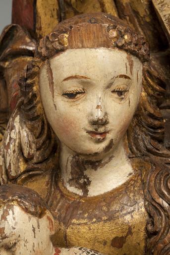 Keywords: MCC-42227 Anna-te-Drieën (7).tif Artwork nl Anonymous Noord-Nederland Anonymous Utrecht nl Anna buigt zich over de rugleuning van de zetel waarop Maria is gezeten die het naakte kind op haar schoot houdt Anna draagt in haar linkerhand een opengeslagen boek Haar rechterhand houdt ze op Maria's rechterschouder Haar hoog opgetrokken linkerbeen staat op een bankje dat van achter de zetel zichtbaar is Het Christuskind laat zijn rechterhand rusten op de appel die Maria in haar rechterhand draagt Het heeft zich iets naar links gewend en laat zijn linkerhand rusten op de linkerarm van Maria Maria ondersteunt met haar linkerhand de opgetrokken beentjes van het kind en houdt zijn rechtervoetje vast Opvallend is de sterk gebogen stand van Maria's rechterbeen waarvan de knie naar binnen is gewend Haar voet lijkt uit haar slof te schieten Anna met hoofd- en kindoek draagt een lang kleed en een over het hoofd geslagen mantel Maria is gekleed in een lang gewaad en mantel en heeft een bloemenkrans om het hoofd Maria en Anna dragen sloffen met ronde neuzen Het kind heeft een geschilderde bloedkoralen ketting om de hals waaraan vroeger een kruisje eveneens geschilderd hing De zetel heeft een hoge brede rugleuning met verdiept middenveld omlijst door een geprofileerde rand en op de bovenhoeken uitkragende versieringen in de vorm van zeer gestileerde pinakels De lage armleuningen zijn aan de bovenzijde hol en aan de voorzijde voorzien van een bolprofiel waaronder een kwarthol en enkele rechte profielen Links en rechts in de voorzijde onder de leuningen een blindnis met twee toten Het bankje achter de zetel heeft een geprofileerde bovenrand De zetel is geplaatst op een grond met smalle parallelle groeven Het beeld staat op een losse rechthoekige geprofileerde plint waarin vier gaten met resten van de nagels voor de bevestiging aanwezig zijn De onderzijde van de plint is uitgehold Polychromie De polychromie is aangebracht op een dunne witte grond de vergulding op een geel-bruine bolus Het incarnaat is bijna wit met roze blossen Helderrode lippen Wimpers rimpels en plooien zijn heel gedetailleerd weergegeven in rose-bruine tinten Bij het kind zijn de details van de oren roze De vingernagels zijn wit met een rode rand Bij Maria en Anna zijn nog bruine irissen aanwezig De wenkbrauwen zijn bruin Het incarnaat van de gezichten wordt begrensd door een roze lijn; zo ook de halspartijen De haren van Maria en het kind zijn verguld Anna's kleed heeft een polimentvergulding De binnenkant van het kleed ter hoogte van de handen is rood met groefjes om bont te suggereren Langs de zoom een dubbele rode lijn Anna's mantel is rood met gouden rand en een zwarte bies tussen het rood en het goud De binnenkant van de mantel is azurietblauw op een zwarte grond De kindoek heeft een dubbele roze bies De doek zelf is wit of grijzig resten blauw pigment Het boek heeft een zwarte band witte bladen met zwarte letters rode beginkapitalen en pargraaftekens en is goud op snee De marges van de tekst zijn aangegeven met een rode lijn Maria heeft een goudkleurig gewaad met roodversierd boord en een brede versierde rand langs de mouwen Aan de binnenkant van de mouwen links groen en rechts groen en blauw De buitenzijde van de blauwe mantel heeft brede gouden boorden waarlangs een gouden lijn; erboven een schulpmotief met op elke punt drie stipjes waardoor een gestileerd bloemmotief ontstaat De binnenkant van de mantel is rood met een smalle gouden bies met zwarte belijning De bloemen van de krans hebben vergulde hartjes en vertonen verder sporen rood De appel vertoont sporen van vergulding en rood onderaan bij de hand van Maria en bij de vingers van het kind Het schoeisel is zwart de binnenkant van Maria's slof is geel haar kous rood Het middenveld van de leuning van de zetel vertoont een brokaatmotief met donkerbruine tot groenige lijnen op goud De spaarvelden in de blindnissen zijn roze de randen van de blindnissen verguld De profilering daarboven en onder afwisselend goud en roze De plint en de zijkanten van de zetel zijn bruin-rood de binnenzijde van de armleuningen roze-rood en de profielen goudkleurig Het zitgedeelte is roze De omlijsting van de rugleuning is gemarmerd in bruinige en zwarte en grijs-roodachtige tinten De knoppen boven op de rugleuningprofilering afwisselend goud en rose Over het algemeen zijn de terugliggende profielen roze en de uitspringende profielen verguld Het bankje van Anna lijkt rood-bruin Op de grond nog een klein restje geel-groen Op de achterzijde is het rood van Anna's mantel op haar hoofd en schouders en op haar linkerbeen doorgezet Techniek De achterzijde is vrij grof afgevlakt De kern ligt links in het werkblok Op het standvlak parallelle gutssporen Een kleine vierkant gaatje bovenin het hoofd van Anna In de rugleuning aan de voorzijde een noest Staat Afgebroken een stukje uit de bloemenkrans; het rechterbolprofiel van de stoelleuning; een hoek van het profiel daaronder; enkele delen uit de grond vooral links wat grotere stukken Scheurvorming vanuit de kern Een grote scheur in de voorzijde is dichtgezet met hout en kunsthars Een gaatje in de rug en twee moderne schroefgaten In het standvlak drie vierkante spijkergaten waarvan twee met resten van spijkers en een onregelmatig ondiep gat De polychromie is over de gehele oppervlakte beschadigd en gesleten vooral op het kleed van Maria between 1495 1504 nl eikenhout verf Size 51 0 29 0 cm nl Hoogte 51 0cm Breedte 29 0cm Diepte 18 0cm Institution Museum Catharijneconvent object history exhibition history credit line nl Foto Museum Catharijneconvent Utrecht foto Ruben de Heer Reproduction title nl Detail accession number Object number 42227 Inventory number ABM bh00499 place of creation https //www catharijneconvent nl/adlib/42227/ View this work on the website of Museum Catharijneconvent Museum Catharijneconvent Cc-zero <gallery> File MCC-42227_Anna-te-Drieën_ 6 tif File MCC-42227_Anna-te-Drieën_ 1 tif File MCC-42227_Anna-te-Drieën_ 11 tif File MCC-