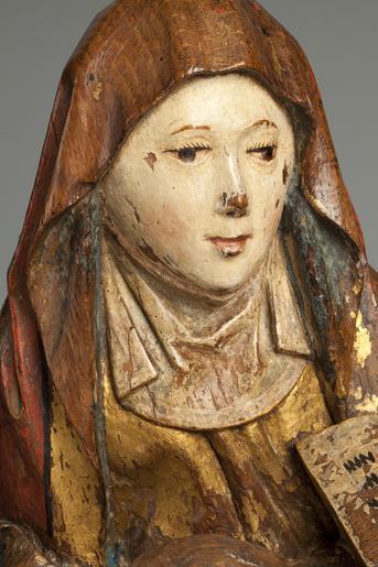 Keywords: MCC-42227 Anna-te-Drieën (9).tif Artwork nl Anonymous Noord-Nederland Anonymous Utrecht nl Anna buigt zich over de rugleuning van de zetel waarop Maria is gezeten die het naakte kind op haar schoot houdt Anna draagt in haar linkerhand een opengeslagen boek Haar rechterhand houdt ze op Maria's rechterschouder Haar hoog opgetrokken linkerbeen staat op een bankje dat van achter de zetel zichtbaar is Het Christuskind laat zijn rechterhand rusten op de appel die Maria in haar rechterhand draagt Het heeft zich iets naar links gewend en laat zijn linkerhand rusten op de linkerarm van Maria Maria ondersteunt met haar linkerhand de opgetrokken beentjes van het kind en houdt zijn rechtervoetje vast Opvallend is de sterk gebogen stand van Maria's rechterbeen waarvan de knie naar binnen is gewend Haar voet lijkt uit haar slof te schieten Anna met hoofd- en kindoek draagt een lang kleed en een over het hoofd geslagen mantel Maria is gekleed in een lang gewaad en mantel en heeft een bloemenkrans om het hoofd Maria en Anna dragen sloffen met ronde neuzen Het kind heeft een geschilderde bloedkoralen ketting om de hals waaraan vroeger een kruisje eveneens geschilderd hing De zetel heeft een hoge brede rugleuning met verdiept middenveld omlijst door een geprofileerde rand en op de bovenhoeken uitkragende versieringen in de vorm van zeer gestileerde pinakels De lage armleuningen zijn aan de bovenzijde hol en aan de voorzijde voorzien van een bolprofiel waaronder een kwarthol en enkele rechte profielen Links en rechts in de voorzijde onder de leuningen een blindnis met twee toten Het bankje achter de zetel heeft een geprofileerde bovenrand De zetel is geplaatst op een grond met smalle parallelle groeven Het beeld staat op een losse rechthoekige geprofileerde plint waarin vier gaten met resten van de nagels voor de bevestiging aanwezig zijn De onderzijde van de plint is uitgehold Polychromie De polychromie is aangebracht op een dunne witte grond de vergulding op een geel-bruine bolus Het incarnaat is bijna wit met roze blossen Helderrode lippen Wimpers rimpels en plooien zijn heel gedetailleerd weergegeven in rose-bruine tinten Bij het kind zijn de details van de oren roze De vingernagels zijn wit met een rode rand Bij Maria en Anna zijn nog bruine irissen aanwezig De wenkbrauwen zijn bruin Het incarnaat van de gezichten wordt begrensd door een roze lijn; zo ook de halspartijen De haren van Maria en het kind zijn verguld Anna's kleed heeft een polimentvergulding De binnenkant van het kleed ter hoogte van de handen is rood met groefjes om bont te suggereren Langs de zoom een dubbele rode lijn Anna's mantel is rood met gouden rand en een zwarte bies tussen het rood en het goud De binnenkant van de mantel is azurietblauw op een zwarte grond De kindoek heeft een dubbele roze bies De doek zelf is wit of grijzig resten blauw pigment Het boek heeft een zwarte band witte bladen met zwarte letters rode beginkapitalen en pargraaftekens en is goud op snee De marges van de tekst zijn aangegeven met een rode lijn Maria heeft een goudkleurig gewaad met roodversierd boord en een brede versierde rand langs de mouwen Aan de binnenkant van de mouwen links groen en rechts groen en blauw De buitenzijde van de blauwe mantel heeft brede gouden boorden waarlangs een gouden lijn; erboven een schulpmotief met op elke punt drie stipjes waardoor een gestileerd bloemmotief ontstaat De binnenkant van de mantel is rood met een smalle gouden bies met zwarte belijning De bloemen van de krans hebben vergulde hartjes en vertonen verder sporen rood De appel vertoont sporen van vergulding en rood onderaan bij de hand van Maria en bij de vingers van het kind Het schoeisel is zwart de binnenkant van Maria's slof is geel haar kous rood Het middenveld van de leuning van de zetel vertoont een brokaatmotief met donkerbruine tot groenige lijnen op goud De spaarvelden in de blindnissen zijn roze de randen van de blindnissen verguld De profilering daarboven en onder afwisselend goud en roze De plint en de zijkanten van de zetel zijn bruin-rood de binnenzijde van de armleuningen roze-rood en de profielen goudkleurig Het zitgedeelte is roze De omlijsting van de rugleuning is gemarmerd in bruinige en zwarte en grijs-roodachtige tinten De knoppen boven op de rugleuningprofilering afwisselend goud en rose Over het algemeen zijn de terugliggende profielen roze en de uitspringende profielen verguld Het bankje van Anna lijkt rood-bruin Op de grond nog een klein restje geel-groen Op de achterzijde is het rood van Anna's mantel op haar hoofd en schouders en op haar linkerbeen doorgezet Techniek De achterzijde is vrij grof afgevlakt De kern ligt links in het werkblok Op het standvlak parallelle gutssporen Een kleine vierkant gaatje bovenin het hoofd van Anna In de rugleuning aan de voorzijde een noest Staat Afgebroken een stukje uit de bloemenkrans; het rechterbolprofiel van de stoelleuning; een hoek van het profiel daaronder; enkele delen uit de grond vooral links wat grotere stukken Scheurvorming vanuit de kern Een grote scheur in de voorzijde is dichtgezet met hout en kunsthars Een gaatje in de rug en twee moderne schroefgaten In het standvlak drie vierkante spijkergaten waarvan twee met resten van spijkers en een onregelmatig ondiep gat De polychromie is over de gehele oppervlakte beschadigd en gesleten vooral op het kleed van Maria between 1495 1504 nl eikenhout verf Size 51 0 29 0 cm nl Hoogte 51 0cm Breedte 29 0cm Diepte 18 0cm Institution Museum Catharijneconvent object history exhibition history credit line nl Foto Museum Catharijneconvent Utrecht foto Ruben de Heer Reproduction title nl Detail accession number Object number 42227 Inventory number ABM bh00499 place of creation https //www catharijneconvent nl/adlib/42227/ View this work on the website of Museum Catharijneconvent Museum Catharijneconvent Cc-zero <gallery> File MCC-42227_Anna-te-Drieën_ 6 tif File MCC-42227_Anna-te-Drieën_ 1 tif File MCC-42227_Anna-te-Drieën_ 11 tif File MCC-