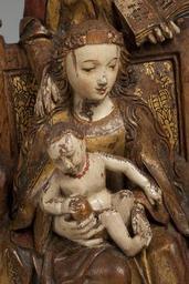 Keywords: MCC-42227 Anna-te-Drieën (4).tif Artwork nl Anonymous Noord-Nederland Anonymous Utrecht nl Anna buigt zich over de rugleuning van de zetel waarop Maria is gezeten die het naakte kind op haar schoot houdt Anna draagt in haar linkerhand een opengeslagen boek Haar rechterhand houdt ze op Maria's rechterschouder Haar hoog opgetrokken linkerbeen staat op een bankje dat van achter de zetel zichtbaar is Het Christuskind laat zijn rechterhand rusten op de appel die Maria in haar rechterhand draagt Het heeft zich iets naar links gewend en laat zijn linkerhand rusten op de linkerarm van Maria Maria ondersteunt met haar linkerhand de opgetrokken beentjes van het kind en houdt zijn rechtervoetje vast Opvallend is de sterk gebogen stand van Maria's rechterbeen waarvan de knie naar binnen is gewend Haar voet lijkt uit haar slof te schieten Anna met hoofd- en kindoek draagt een lang kleed en een over het hoofd geslagen mantel Maria is gekleed in een lang gewaad en mantel en heeft een bloemenkrans om het hoofd Maria en Anna dragen sloffen met ronde neuzen Het kind heeft een geschilderde bloedkoralen ketting om de hals waaraan vroeger een kruisje eveneens geschilderd hing De zetel heeft een hoge brede rugleuning met verdiept middenveld omlijst door een geprofileerde rand en op de bovenhoeken uitkragende versieringen in de vorm van zeer gestileerde pinakels De lage armleuningen zijn aan de bovenzijde hol en aan de voorzijde voorzien van een bolprofiel waaronder een kwarthol en enkele rechte profielen Links en rechts in de voorzijde onder de leuningen een blindnis met twee toten Het bankje achter de zetel heeft een geprofileerde bovenrand De zetel is geplaatst op een grond met smalle parallelle groeven Het beeld staat op een losse rechthoekige geprofileerde plint waarin vier gaten met resten van de nagels voor de bevestiging aanwezig zijn De onderzijde van de plint is uitgehold Polychromie De polychromie is aangebracht op een dunne witte grond de vergulding op een geel-bruine bolus Het incarnaat is bijna wit met roze blossen Helderrode lippen Wimpers rimpels en plooien zijn heel gedetailleerd weergegeven in rose-bruine tinten Bij het kind zijn de details van de oren roze De vingernagels zijn wit met een rode rand Bij Maria en Anna zijn nog bruine irissen aanwezig De wenkbrauwen zijn bruin Het incarnaat van de gezichten wordt begrensd door een roze lijn; zo ook de halspartijen De haren van Maria en het kind zijn verguld Anna's kleed heeft een polimentvergulding De binnenkant van het kleed ter hoogte van de handen is rood met groefjes om bont te suggereren Langs de zoom een dubbele rode lijn Anna's mantel is rood met gouden rand en een zwarte bies tussen het rood en het goud De binnenkant van de mantel is azurietblauw op een zwarte grond De kindoek heeft een dubbele roze bies De doek zelf is wit of grijzig resten blauw pigment Het boek heeft een zwarte band witte bladen met zwarte letters rode beginkapitalen en pargraaftekens en is goud op snee De marges van de tekst zijn aangegeven met een rode lijn Maria heeft een goudkleurig gewaad met roodversierd boord en een brede versierde rand langs de mouwen Aan de binnenkant van de mouwen links groen en rechts groen en blauw De buitenzijde van de blauwe mantel heeft brede gouden boorden waarlangs een gouden lijn; erboven een schulpmotief met op elke punt drie stipjes waardoor een gestileerd bloemmotief ontstaat De binnenkant van de mantel is rood met een smalle gouden bies met zwarte belijning De bloemen van de krans hebben vergulde hartjes en vertonen verder sporen rood De appel vertoont sporen van vergulding en rood onderaan bij de hand van Maria en bij de vingers van het kind Het schoeisel is zwart de binnenkant van Maria's slof is geel haar kous rood Het middenveld van de leuning van de zetel vertoont een brokaatmotief met donkerbruine tot groenige lijnen op goud De spaarvelden in de blindnissen zijn roze de randen van de blindnissen verguld De profilering daarboven en onder afwisselend goud en roze De plint en de zijkanten van de zetel zijn bruin-rood de binnenzijde van de armleuningen roze-rood en de profielen goudkleurig Het zitgedeelte is roze De omlijsting van de rugleuning is gemarmerd in bruinige en zwarte en grijs-roodachtige tinten De knoppen boven op de rugleuningprofilering afwisselend goud en rose Over het algemeen zijn de terugliggende profielen roze en de uitspringende profielen verguld Het bankje van Anna lijkt rood-bruin Op de grond nog een klein restje geel-groen Op de achterzijde is het rood van Anna's mantel op haar hoofd en schouders en op haar linkerbeen doorgezet Techniek De achterzijde is vrij grof afgevlakt De kern ligt links in het werkblok Op het standvlak parallelle gutssporen Een kleine vierkant gaatje bovenin het hoofd van Anna In de rugleuning aan de voorzijde een noest Staat Afgebroken een stukje uit de bloemenkrans; het rechterbolprofiel van de stoelleuning; een hoek van het profiel daaronder; enkele delen uit de grond vooral links wat grotere stukken Scheurvorming vanuit de kern Een grote scheur in de voorzijde is dichtgezet met hout en kunsthars Een gaatje in de rug en twee moderne schroefgaten In het standvlak drie vierkante spijkergaten waarvan twee met resten van spijkers en een onregelmatig ondiep gat De polychromie is over de gehele oppervlakte beschadigd en gesleten vooral op het kleed van Maria between 1495 1504 nl eikenhout verf Size 51 0 29 0 cm nl Hoogte 51 0cm Breedte 29 0cm Diepte 18 0cm Institution Museum Catharijneconvent object history exhibition history credit line nl Foto Museum Catharijneconvent Utrecht foto Ruben de Heer Reproduction title nl Detail accession number Object number 42227 Inventory number ABM bh00499 place of creation https //www catharijneconvent nl/adlib/42227/ View this work on the website of Museum Catharijneconvent Museum Catharijneconvent Cc-zero <gallery> File MCC-42227_Anna-te-Drieën_ 6 tif File MCC-42227_Anna-te-Drieën_ 1 tif File MCC-42227_Anna-te-Drieën_ 11 tif File MCC-