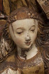Keywords: MCC-42227 Anna-te-Drieën (8).tif Artwork nl Anonymous Noord-Nederland Anonymous Utrecht nl Anna buigt zich over de rugleuning van de zetel waarop Maria is gezeten die het naakte kind op haar schoot houdt Anna draagt in haar linkerhand een opengeslagen boek Haar rechterhand houdt ze op Maria's rechterschouder Haar hoog opgetrokken linkerbeen staat op een bankje dat van achter de zetel zichtbaar is Het Christuskind laat zijn rechterhand rusten op de appel die Maria in haar rechterhand draagt Het heeft zich iets naar links gewend en laat zijn linkerhand rusten op de linkerarm van Maria Maria ondersteunt met haar linkerhand de opgetrokken beentjes van het kind en houdt zijn rechtervoetje vast Opvallend is de sterk gebogen stand van Maria's rechterbeen waarvan de knie naar binnen is gewend Haar voet lijkt uit haar slof te schieten Anna met hoofd- en kindoek draagt een lang kleed en een over het hoofd geslagen mantel Maria is gekleed in een lang gewaad en mantel en heeft een bloemenkrans om het hoofd Maria en Anna dragen sloffen met ronde neuzen Het kind heeft een geschilderde bloedkoralen ketting om de hals waaraan vroeger een kruisje eveneens geschilderd hing De zetel heeft een hoge brede rugleuning met verdiept middenveld omlijst door een geprofileerde rand en op de bovenhoeken uitkragende versieringen in de vorm van zeer gestileerde pinakels De lage armleuningen zijn aan de bovenzijde hol en aan de voorzijde voorzien van een bolprofiel waaronder een kwarthol en enkele rechte profielen Links en rechts in de voorzijde onder de leuningen een blindnis met twee toten Het bankje achter de zetel heeft een geprofileerde bovenrand De zetel is geplaatst op een grond met smalle parallelle groeven Het beeld staat op een losse rechthoekige geprofileerde plint waarin vier gaten met resten van de nagels voor de bevestiging aanwezig zijn De onderzijde van de plint is uitgehold Polychromie De polychromie is aangebracht op een dunne witte grond de vergulding op een geel-bruine bolus Het incarnaat is bijna wit met roze blossen Helderrode lippen Wimpers rimpels en plooien zijn heel gedetailleerd weergegeven in rose-bruine tinten Bij het kind zijn de details van de oren roze De vingernagels zijn wit met een rode rand Bij Maria en Anna zijn nog bruine irissen aanwezig De wenkbrauwen zijn bruin Het incarnaat van de gezichten wordt begrensd door een roze lijn; zo ook de halspartijen De haren van Maria en het kind zijn verguld Anna's kleed heeft een polimentvergulding De binnenkant van het kleed ter hoogte van de handen is rood met groefjes om bont te suggereren Langs de zoom een dubbele rode lijn Anna's mantel is rood met gouden rand en een zwarte bies tussen het rood en het goud De binnenkant van de mantel is azurietblauw op een zwarte grond De kindoek heeft een dubbele roze bies De doek zelf is wit of grijzig resten blauw pigment Het boek heeft een zwarte band witte bladen met zwarte letters rode beginkapitalen en pargraaftekens en is goud op snee De marges van de tekst zijn aangegeven met een rode lijn Maria heeft een goudkleurig gewaad met roodversierd boord en een brede versierde rand langs de mouwen Aan de binnenkant van de mouwen links groen en rechts groen en blauw De buitenzijde van de blauwe mantel heeft brede gouden boorden waarlangs een gouden lijn; erboven een schulpmotief met op elke punt drie stipjes waardoor een gestileerd bloemmotief ontstaat De binnenkant van de mantel is rood met een smalle gouden bies met zwarte belijning De bloemen van de krans hebben vergulde hartjes en vertonen verder sporen rood De appel vertoont sporen van vergulding en rood onderaan bij de hand van Maria en bij de vingers van het kind Het schoeisel is zwart de binnenkant van Maria's slof is geel haar kous rood Het middenveld van de leuning van de zetel vertoont een brokaatmotief met donkerbruine tot groenige lijnen op goud De spaarvelden in de blindnissen zijn roze de randen van de blindnissen verguld De profilering daarboven en onder afwisselend goud en roze De plint en de zijkanten van de zetel zijn bruin-rood de binnenzijde van de armleuningen roze-rood en de profielen goudkleurig Het zitgedeelte is roze De omlijsting van de rugleuning is gemarmerd in bruinige en zwarte en grijs-roodachtige tinten De knoppen boven op de rugleuningprofilering afwisselend goud en rose Over het algemeen zijn de terugliggende profielen roze en de uitspringende profielen verguld Het bankje van Anna lijkt rood-bruin Op de grond nog een klein restje geel-groen Op de achterzijde is het rood van Anna's mantel op haar hoofd en schouders en op haar linkerbeen doorgezet Techniek De achterzijde is vrij grof afgevlakt De kern ligt links in het werkblok Op het standvlak parallelle gutssporen Een kleine vierkant gaatje bovenin het hoofd van Anna In de rugleuning aan de voorzijde een noest Staat Afgebroken een stukje uit de bloemenkrans; het rechterbolprofiel van de stoelleuning; een hoek van het profiel daaronder; enkele delen uit de grond vooral links wat grotere stukken Scheurvorming vanuit de kern Een grote scheur in de voorzijde is dichtgezet met hout en kunsthars Een gaatje in de rug en twee moderne schroefgaten In het standvlak drie vierkante spijkergaten waarvan twee met resten van spijkers en een onregelmatig ondiep gat De polychromie is over de gehele oppervlakte beschadigd en gesleten vooral op het kleed van Maria between 1495 1504 nl eikenhout verf Size 51 0 29 0 cm nl Hoogte 51 0cm Breedte 29 0cm Diepte 18 0cm Institution Museum Catharijneconvent object history exhibition history credit line nl Foto Museum Catharijneconvent Utrecht foto Ruben de Heer Reproduction title nl Detail accession number Object number 42227 Inventory number ABM bh00499 place of creation https //www catharijneconvent nl/adlib/42227/ View this work on the website of Museum Catharijneconvent Museum Catharijneconvent Cc-zero <gallery> File MCC-42227_Anna-te-Drieën_ 6 tif File MCC-42227_Anna-te-Drieën_ 1 tif File MCC-42227_Anna-te-Drieën_ 11 tif File MCC-