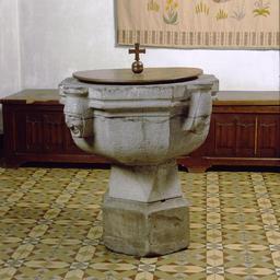 Keywords: MCC-42291 Doopvont, achtzijdige kuip met sferische vlakken, vier verschillende maskers aan bovenzijde (2).tif Artwork nl Anonymous Maasland nl De doopvont bestaat uit een achtzijdige kuip met sferische vlakken; aan de bovenrand een profiel bestaande uit kwarthol staaf halfhol en een kleiner staafprofiel Vier van de acht vlakken dragen aan de bovenzijde een maskerkop die aan de bovenzijde vlak is en halfrond uitspringt ten opzichte van het vlak van de rand Beschrijving van de koppen van links naar rechts De eerste heeft een lang gelaat met hoge jukbeenderen van boven afgeplatte amandelvormige ogen met aangeduide pupil en iris waarboven veel ruimte een hoekige kin en een haakneus Hij laat breed grijnzend zijn gebit zien De overige drie hebben afgezien van de neus die bij deze koppen recht is met uitstaande neusvleugels dezelfde gelaatsvorm maar kijken ernstig en hebben een smalle mond met iets naar beneden gebogen mondhoeken De hoofdbedekking is bij alle koppen verschillend Bij alle varianten zijn de oren bedekt Het eerste gelaat is omgeven door een nauwsluitende hoofdbedekking de tweede kop draagt een zich naar boven versmallende hoed de derde een muts waarvan de punt naar voren hangt en de vierde heeft een aan de voorzijde afgeplatte ronde hoofdbedekking De uitholling van de kuip is half bol van vorm In de brede bovenrand van de kuip zijn in twee tegenover elkaar liggende zijden dookgaten te zien één rechthoekig gat van ca 4 5 x 3 cm één ovaal uitgesleten gat van 5 5 x 4 5 cm Aan één zijde in de rand een 10 cm brede ondiepe uitholling over de gehele breedte De doopvont staat op een 18 5 cm hoge tufstenen of kunststenen schacht die de overgang vormt naar een 29 5 cm hoge zeszijdige zandstenen voet De vlakken van schacht en voet zijn iets hol Techniek De binnenzijde van de vont is glad Op de bovenrand smalle evenwijdige beitelsporen Het oppervlak van de vont is bedekt met een vrij regelmatig patroon van ingehamerde ronde punten gebouchardeerd met uitzondering van de gezichten het holprofiel met de rand daarboven en de graten tussen de vlakken Het oppervlak van de schacht is afgewerkt met evenwijdige horizontale lijnen tandbeitel Staat Voet en schacht behoren niet bij de kuip De voet lijkt oud de schacht is modern Bij de vont wordt een modern rond eiken deksel gebruikt met in het midden een bol met kruis Het oorspronkelijke deksel ontbreekt Afgebroken vele kleine delen langs de randen langs een natuurlijke breuk die loopt ter hoogte van de profielrand en het bovenste deel van de gezichten Deze breuk loopt vrijwel rondom door de gehele vont behalve ter plaatse van de 10 cm brede uitholling in de rand In de breuk hier en daar invullingen Alle neuzen van de figuren zijn beschadigd De graten van de voet zijn beschadigd In de bovenrand een onregelmatig rechthoekige beschadiging Aan de binnenzijde van de vont kalkafzetting between 1400 1499 nl Naamse steen Size 91 0 80 0 cm nl Hoogte 91 0cm Breedte 80 0cm Diepte 79 5cm Institution Museum Catharijneconvent object history exhibition history credit line nl Foto Museum Catharijneconvent Utrecht foto Ruben de Heer accession number Object number 42291 Inventory number ABM bs00611 place of creation https //www catharijneconvent nl/adlib/42291/ View this work on the website of Museum Catharijneconvent Museum Catharijneconvent Cc-zero <gallery> File MCC-42291_Doopvont _achtzijdige_kuip_met_sferische_vlakken _vier_verschillende_maskers_aan_bovenzijde_ 2 tif File MCC-42291_Doopvont _achtzijdige_kuip_met_sferische_vlakken _vier_verschillende_maskers_aan_bovenzijde_ 3 jpg File MCC-42291_Doopvont _achtzijdige_kuip_met_sferische_vlakken _vier_verschillende_maskers_aan_bovenzijde_ 1 tif </gallery> Items from the Catharinazaal Uncategorized 2015 March 1 |