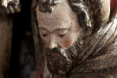Keywords: MCC-42318 Geboorte van Christus, aanbidding der herders (27).tif Artwork nl Anonymous Utrecht nl Voor een vervallen stal in het midden van de voorstelling knielt Maria links in aanbidding neer bij het kindje dat in het stro ligt Ook zijn twee engelen bij het kind neergeknield De ene en profil rechts op de voorgrond bespeelt een harp die hij voor zich houdt De andere zit schuin achter het kindje rechts van Maria en heeft zijn handen gevouwen voor zich Achter de harpspelende engel staat Jozef driekwart naar links gewend Hij kijkt wat voorovergebogen op het kind neer In zijn verdwenen linkerhand droeg hij waarschijnlijk een kaars waarvan hij het licht met zijn geheven rechter hand afschermde tegen de stralen die van het kind uitgaan Op de achtergrond rechts boven op een rots of heuvel staat een derde engel die met zijn rechterhand het kind aanwijst aan een klein afgebeelde herder die rechts naast hem loopt In de stal achter een met leem bestreken tenen wand kijkt nog een herder toe waarvan alleen het hoofd en de schouders zichtbaar zijn Het dak van de stal rust op vier pilaren In de voorzijde ervan is een rechthoekig venster aangebracht waarin twee duifjes zitten Tussen de twee linkerpilaren door hebben de os en de ezel hun koppen naar buiten gestoken Terwijl de os naar voren kijkt neemt de ezel een flinke hap stro uit de kribbe die voor hem staat Het linker gedeelte van de voorstelling wordt ingenomen door een grote rotsige heuvelpartij waarvoor een herder staat Hij heeft zijn bovenlichaam bijna en profil naar rechts gedraaid en zijn linkerbeen iets naar voren geplaatst en kijkt naar het geboortetafereel Hij leunt met beide handen op een herdersstaf die aan de onderzijde voorzien is van een schep De heuvelige bodem is afgewerkt met zigzaggroeven Maria draagt een lang gewaad Haar mantel is van haar rechterschouder gegleden tot op haar heupen en bedekt in soepele plooien de grond Haar kleed heeft omgeslagen mouwboorden Over haar hoofd een deels teruggeslagen sluier De engelen zijn gekleed in gegorde albes De achterste engel heeft een diadeem op het hoofd Aan de gordel rond Jozefs kleed hangt een rozenkrans Zijn mantel is teruggeslagen over zijn linker schouder Op zijn hoofd een kaproenachtig hoofddeksel en om zijn hals een grote sjaal De herder rechts op de achtergrond heeft een hoed met opgeslagen achterrand op het hoofd Hij draagt een korte gegorde tuniek met v-hals Aan zijn riem hangen een tas en een hoornachtig voorwerp Hij heeft puntig schoeisel en zijn kousen lijken afgerold Van de herder achter de wand is alleen te zien dat hij een kap draagt De linker herder is gekleed in een korte gegorde tuniek met kort ingesneden wambuis en lage schoenen met afgeronde neus Op zijn hoofd een hoed waar aan de linkerkant een doek onderuit hangt Zijn handen zijn in wanten gestoken Polychromie Het stuk is deels bedekt met oude maar niet oorspronkelijke polychromie De bruine retouches van de witte grond en de lacunes maken het moeilijk nog onderliggende lagen te onderscheiden Het stuk lijkt grondig schoongemaakt voordat het opnieuw is gestoffeerd Incarnaat lichtroze met rode blossen De herders vertonen een oranje-achtig incarnaat De ogen zijn gedetailleerd in zwart en bruin; monden helderrood Maria's haar is bruin haar sluier en binnenkant van de mantel blauw; buitenzijden mantel deels rood deels blauw verkeerd geïnterpreteerd door de stoffeerder ; gewaad rood met vergulde boorden De matte vergulding lijkt op een gelige grond te liggen De albes van de engelen zijn roze Hun haar matverguld op een gelige grond De harp is verguld De boorden van de albes zijn verguld Jozef haar bruin rand van de hoed verguld op gelige grond; slip rood; sjaal wit; kleed en rozenkrans rood; mantel bruin Kleine herder hoed rood; haar donkerbruin waaronder resten van oranjerood bolus ; kleed blauw; hoorn gordel en tas gelig; kousen en schoenen donkerrood Kap herder blauw met een witte rand Os rood tanden wit hoorns roze Ezel lichtbruin Stro geel Ruif lichtbruin waarop donkerbruin Herder links hoed blauw met rode slip; wambuis bruin met rode kraag manchetten en split; tuniek blauw waarop sporen vergulding; buidel lichtgeel; kousen wit; schoenen donkerbruin Onder het wit van de kousen mogelijk roze incarnaat Staf lichtbruin met blauwe schep Stal zuilen en achterwand rechts donkerbruin; strodak geelbruin; gevel donkerbruin met witte duifjes waarvan er een een rode snavel heeft; wand blauw; vleugels middelste geknielde engel wit met vergulde rand Heuvels resten geel bruin en groen Het geel ligt deels over het groen Rotsen links bovenaan heel lichtroze waaronder vergulding op rood-achtige bolus Techniek De groep is uit meerdere delen samengesteld Het rechtergedeelte met de stal Maria Jozef en de engelen vormt één geheel uitgezonderd de rechts op de voorgrond knielende engel en het kindje op het stro De kern lag achter het werkblok Aan dit gedeelte zijn toegevoegd het rechterduifje in de stal genoemd kindje en engel en de grond onder de engel De figuren op de voorgrond zijn rondom bewerkt Het linkergedeelte met de rotsen en de grote herderfiguur vormt één geheel De herder is bijna rondom uitgewerkt De twee delen zijn aan elkaar gezet door middel van houten pennen en verbindingsplankjes die met grote nagels in de onderzijde van de delen zijn bevestigd Ook bovenaan de achterzijde bevindt zich een origineel verbindingsplankje vastgezet met zes gesmede nagels twee verdwenen Mogelijk liep dit plankje verder door naar links waar nog twee gesmede nagels aanwezig zijn Een deel van de grond tussen beide delen vormt eveneens een verbinding en is met twee houten pennen en een ijzeren nagel in de voorzijde vastgezet De grond onder de engel is met houten pennen en een metalen nagel bevestigd Het kind is op de grond gelijmd en ingepend De harp bestaat uit twee delen De linkerhand van de linkerengel vormt één geheel met de snaren De delen lijken gelijmd en daarna met een grote nagel onderaan in de engel vastgezet Het rechter duifje